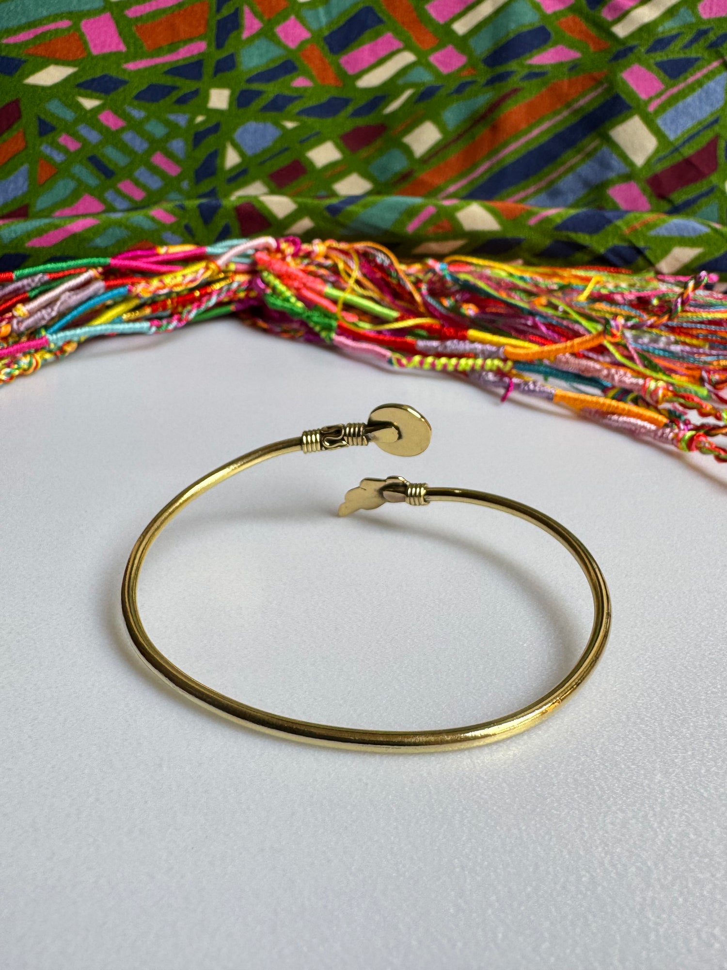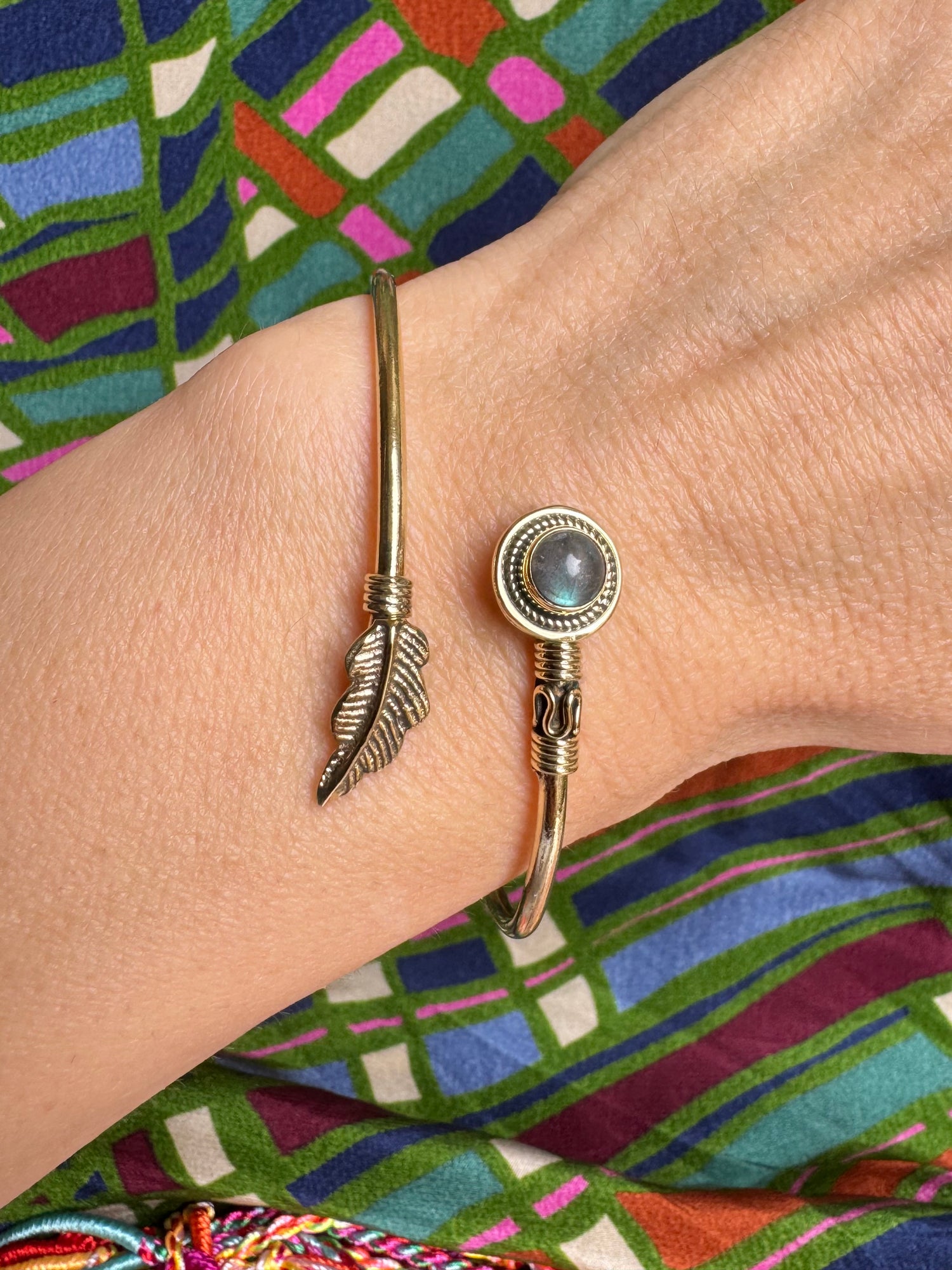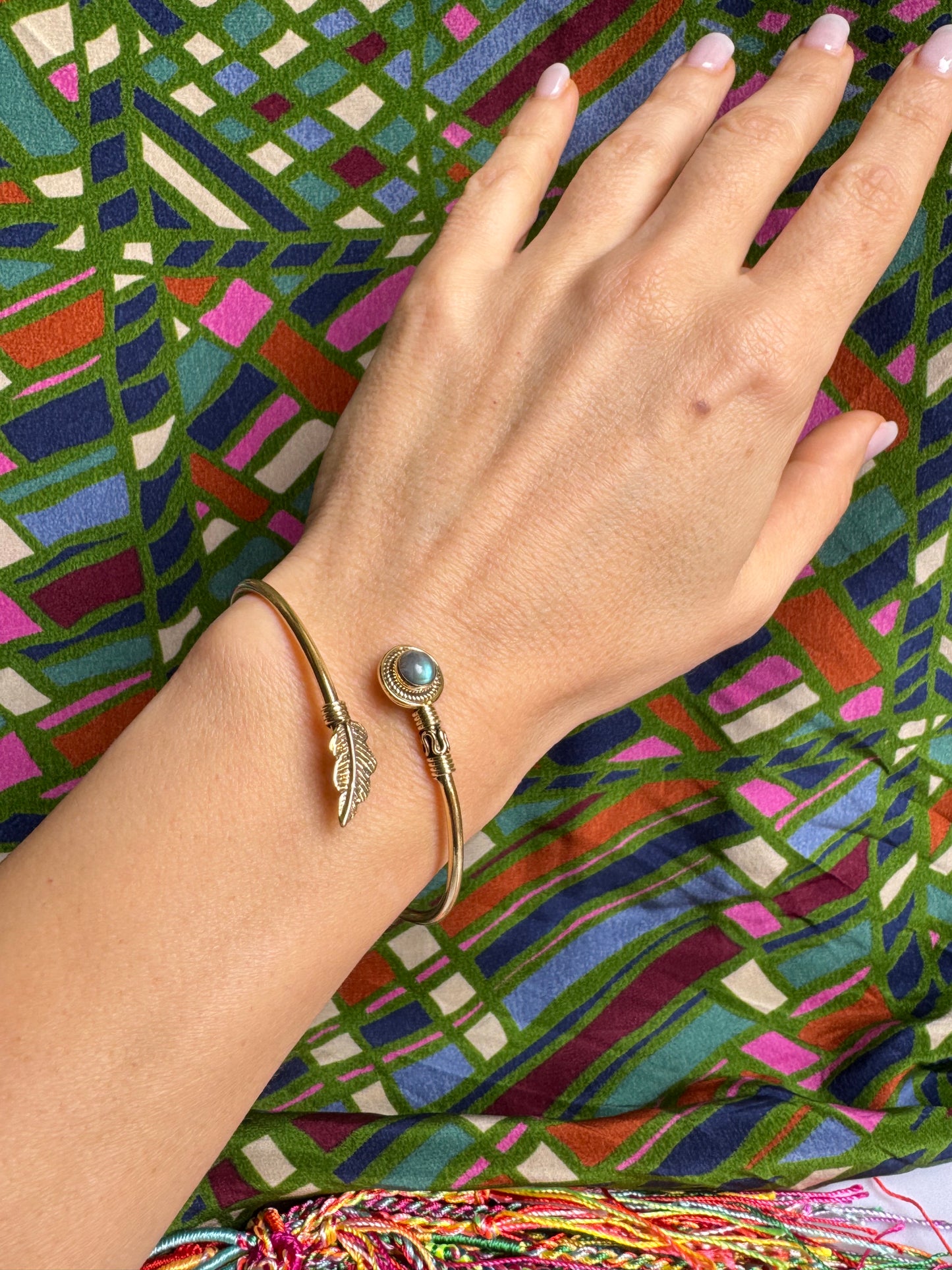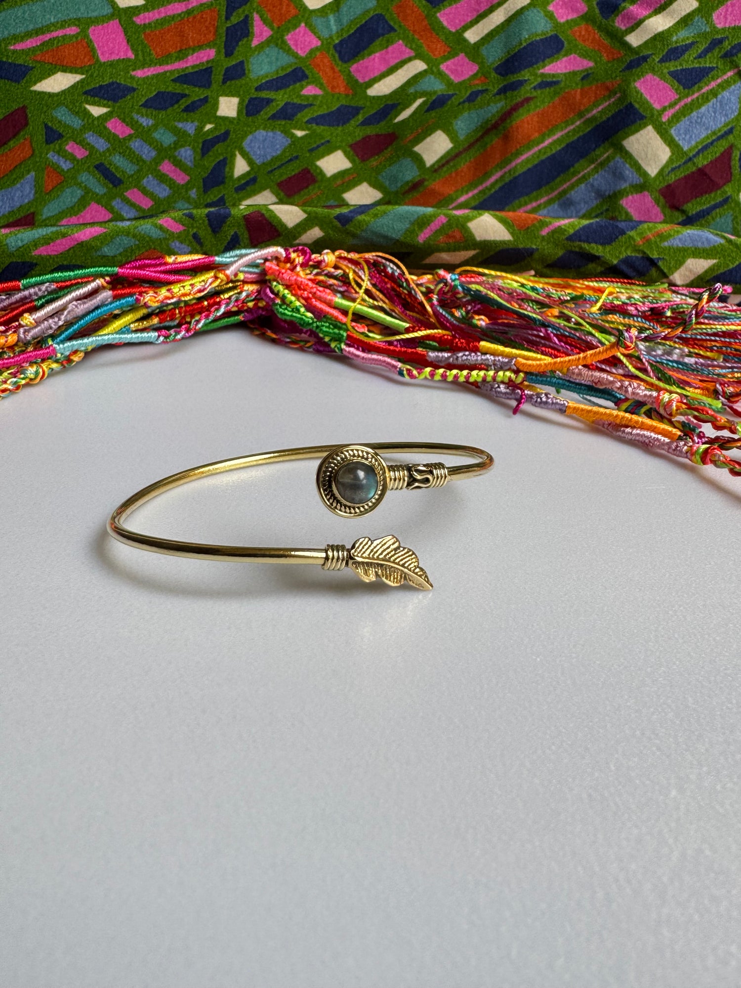 Starres Armband aus hypoallergenem, vergoldetem Messing und eingesetztem labradoritähnlichem Stein. Einstellbar.