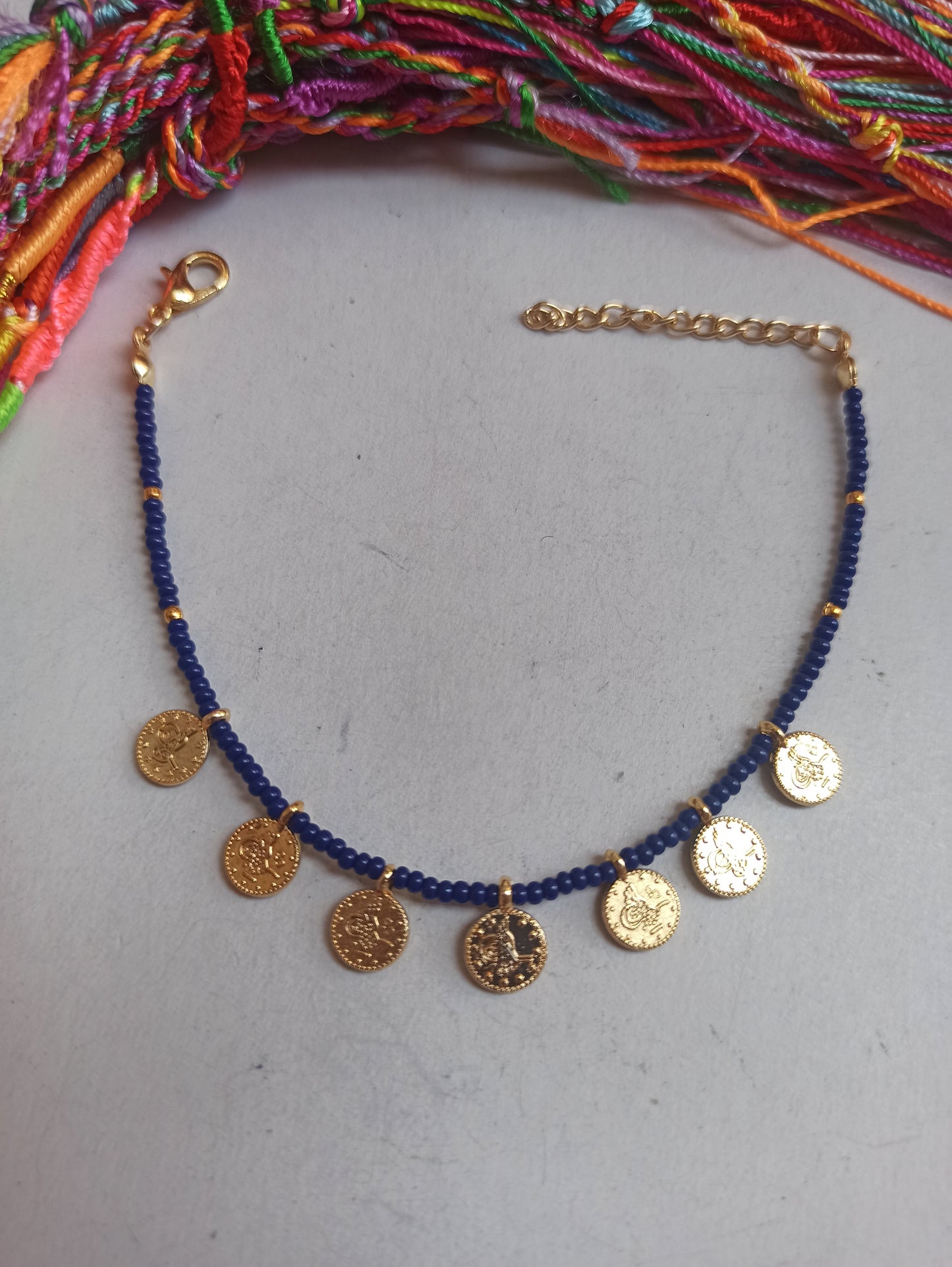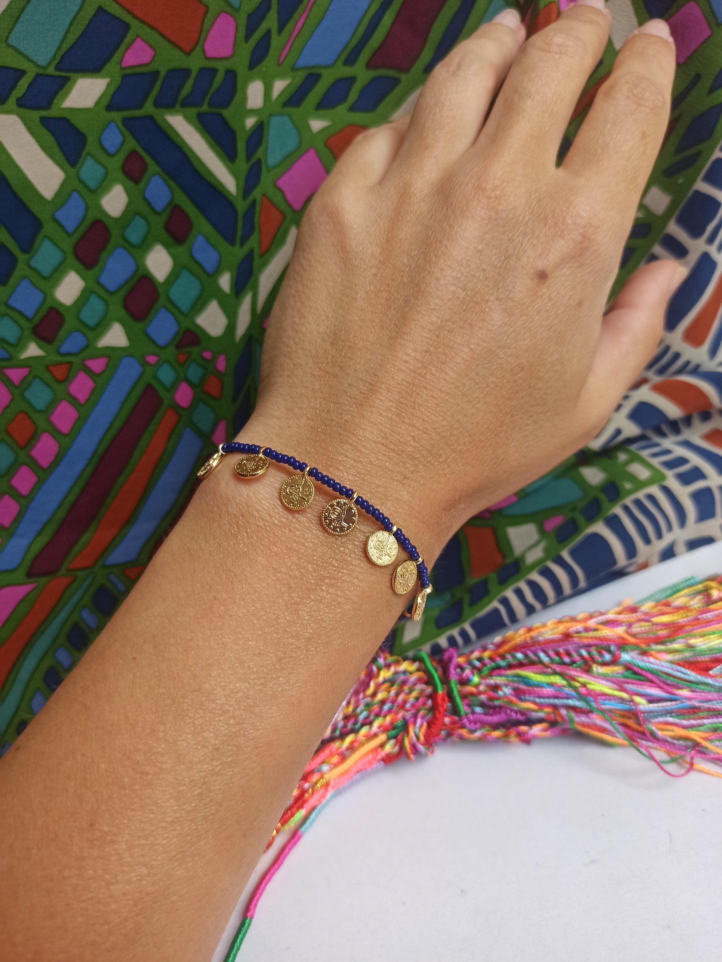 Armband mit Perlen und goldenem Metall. Einstellbar.