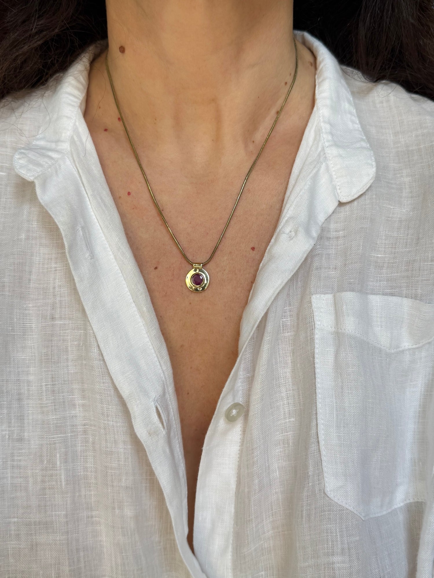 Catenina con ciondolo in ottone con inserto simil radice di rubino.