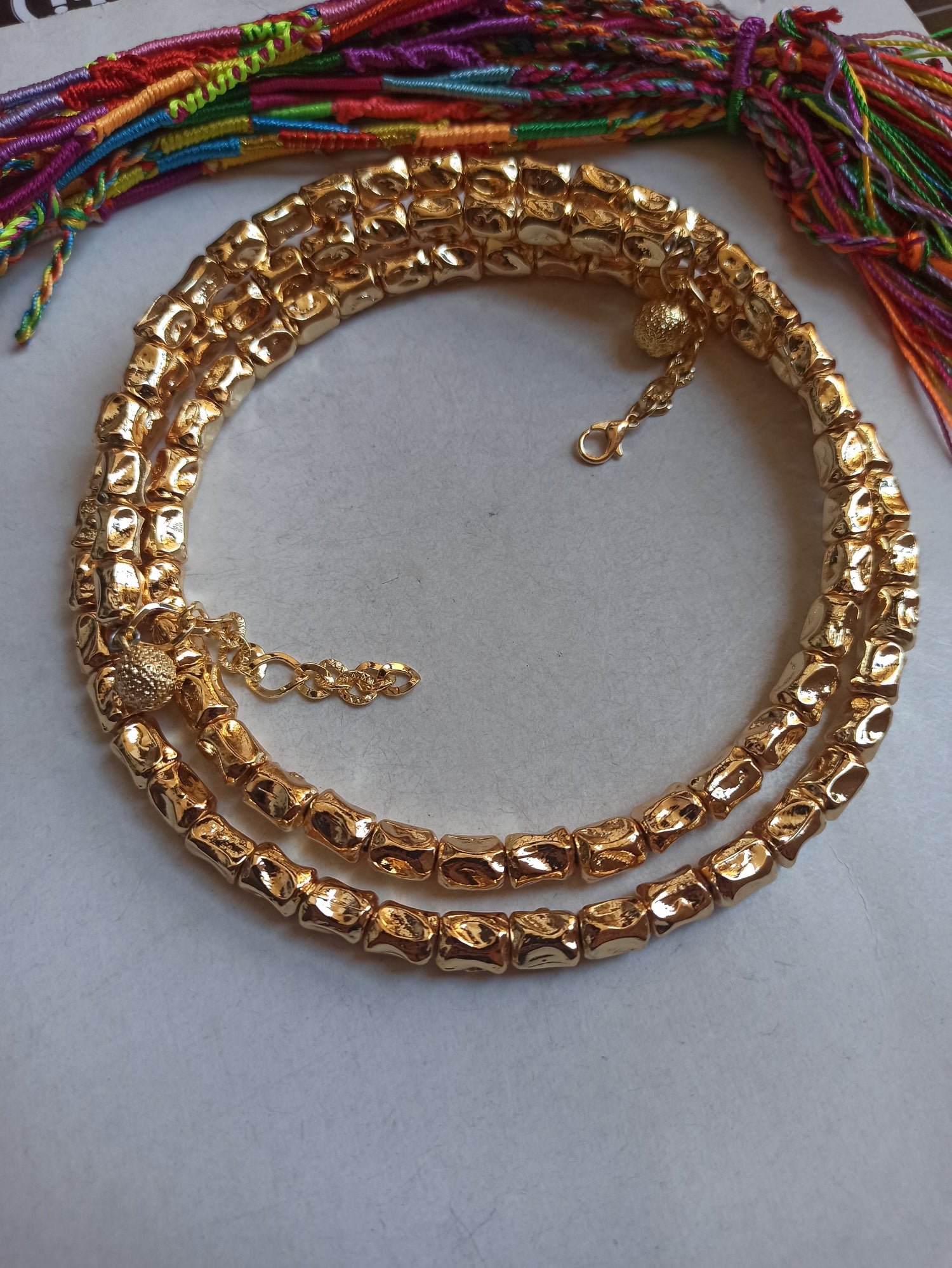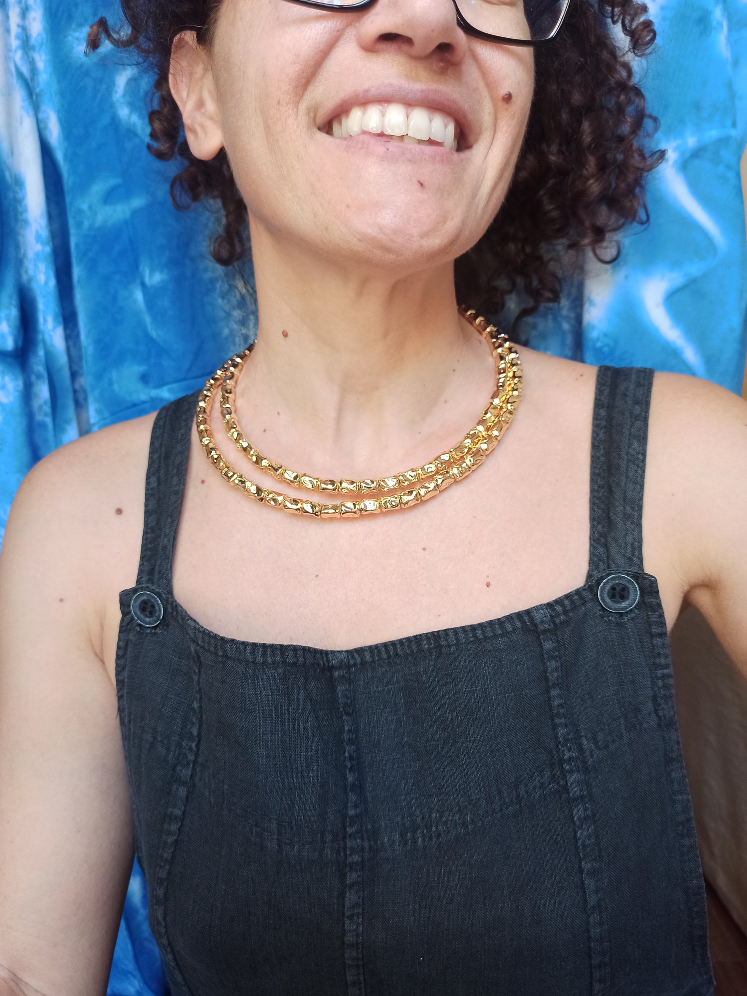 Eine spezielle Halskette aus einer Metalllegierung, die teilweise so modifiziert werden kann, dass sie als schmale Halskette mit zwei Windungen, als breite Halskette mit zwei Windungen oder mit einem schmaleren und einem breiteren Ring getragen werden kann.