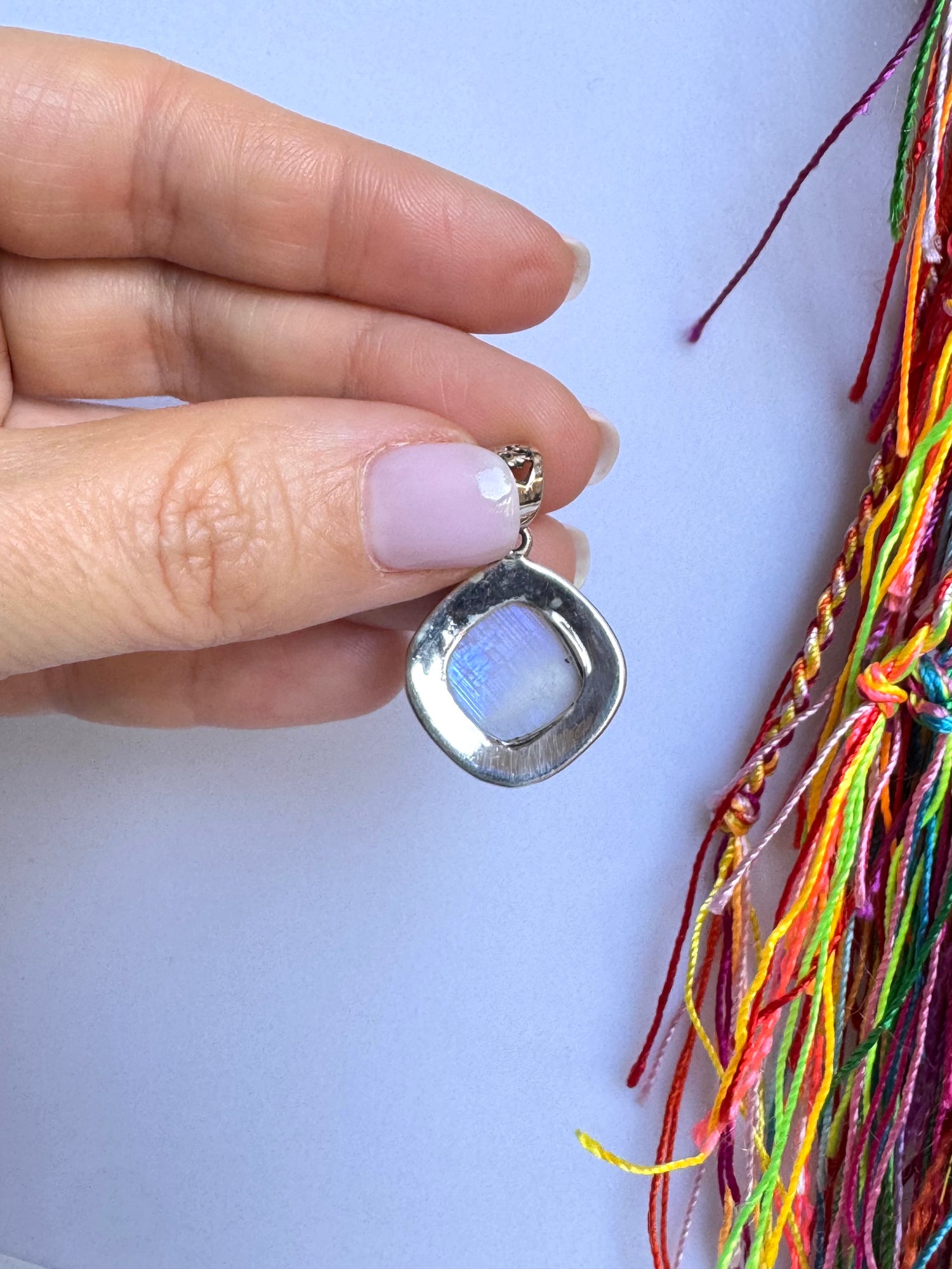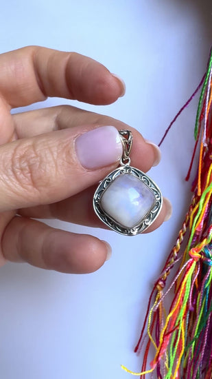 Ciondolo in argento 925 con incastonata una pietra di luna arcobaleno.