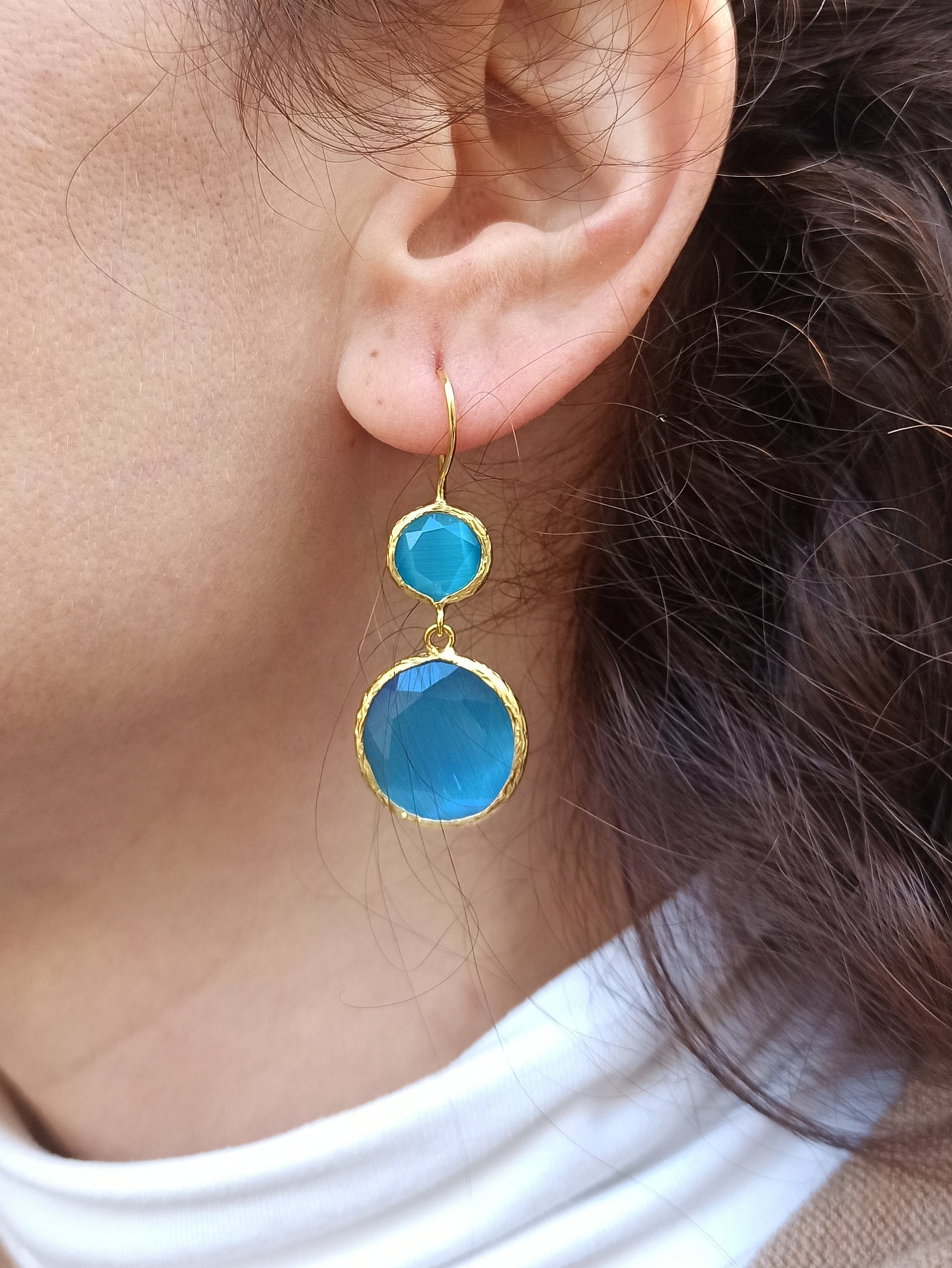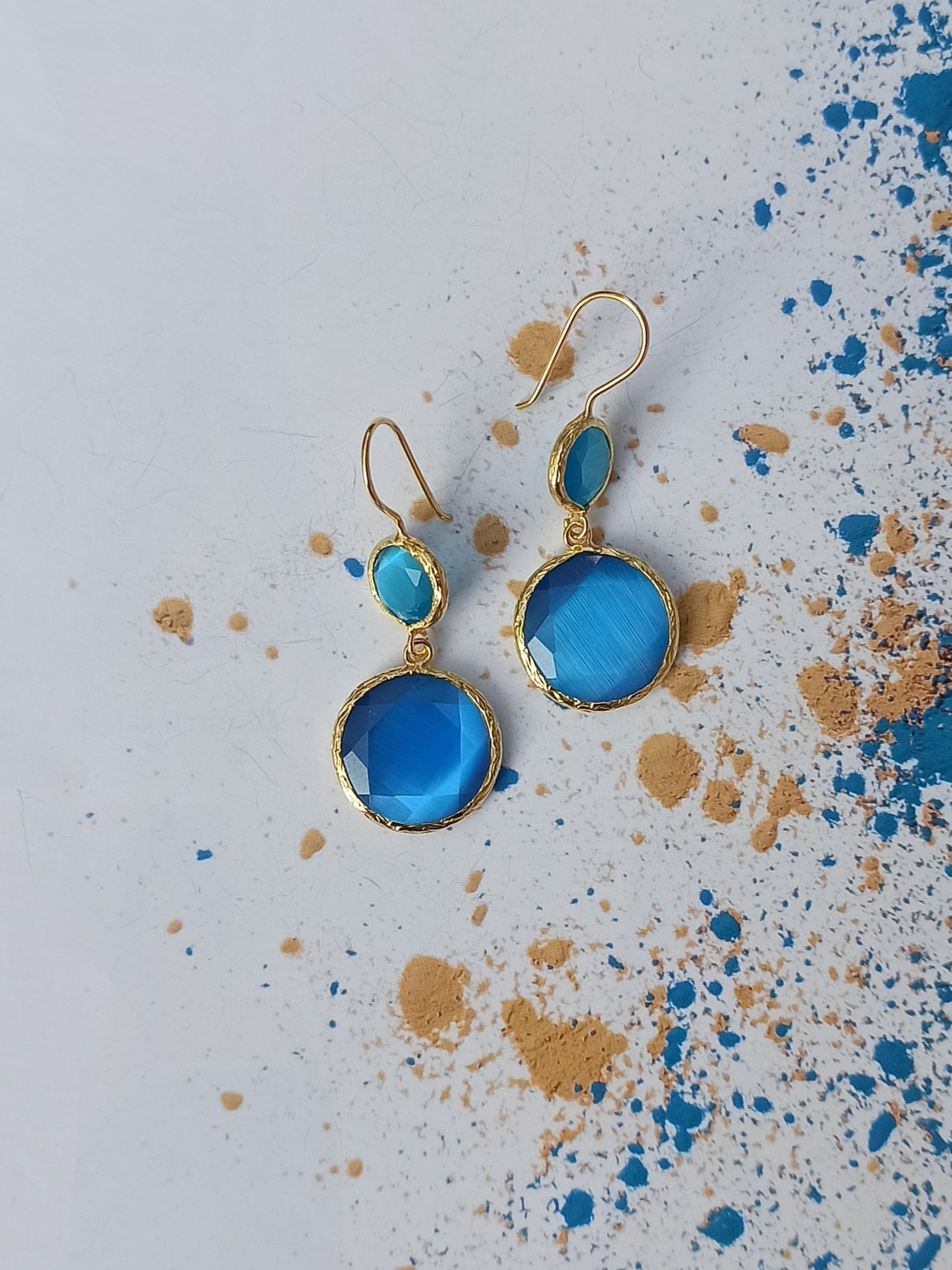 Hypoallergene Messingohrringe mit hellblauem Katzenaugenstein. Nickelfrei. Länge 5cm.
