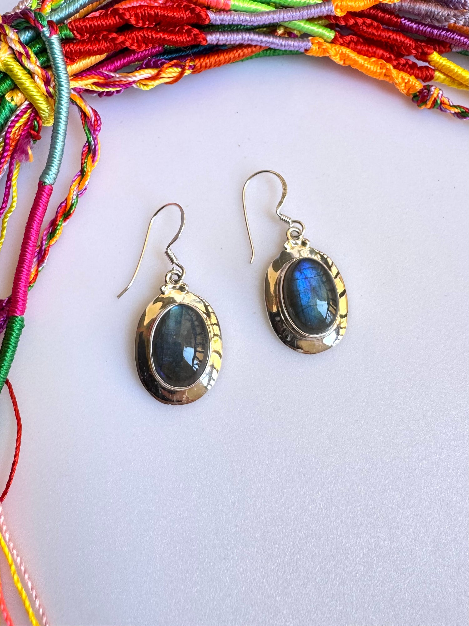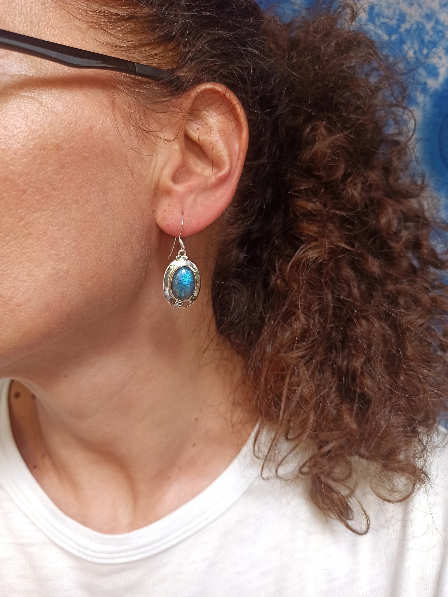 Ohrringe aus 925er Silber mit einem Labradorit- Stein. Länge 5 cm