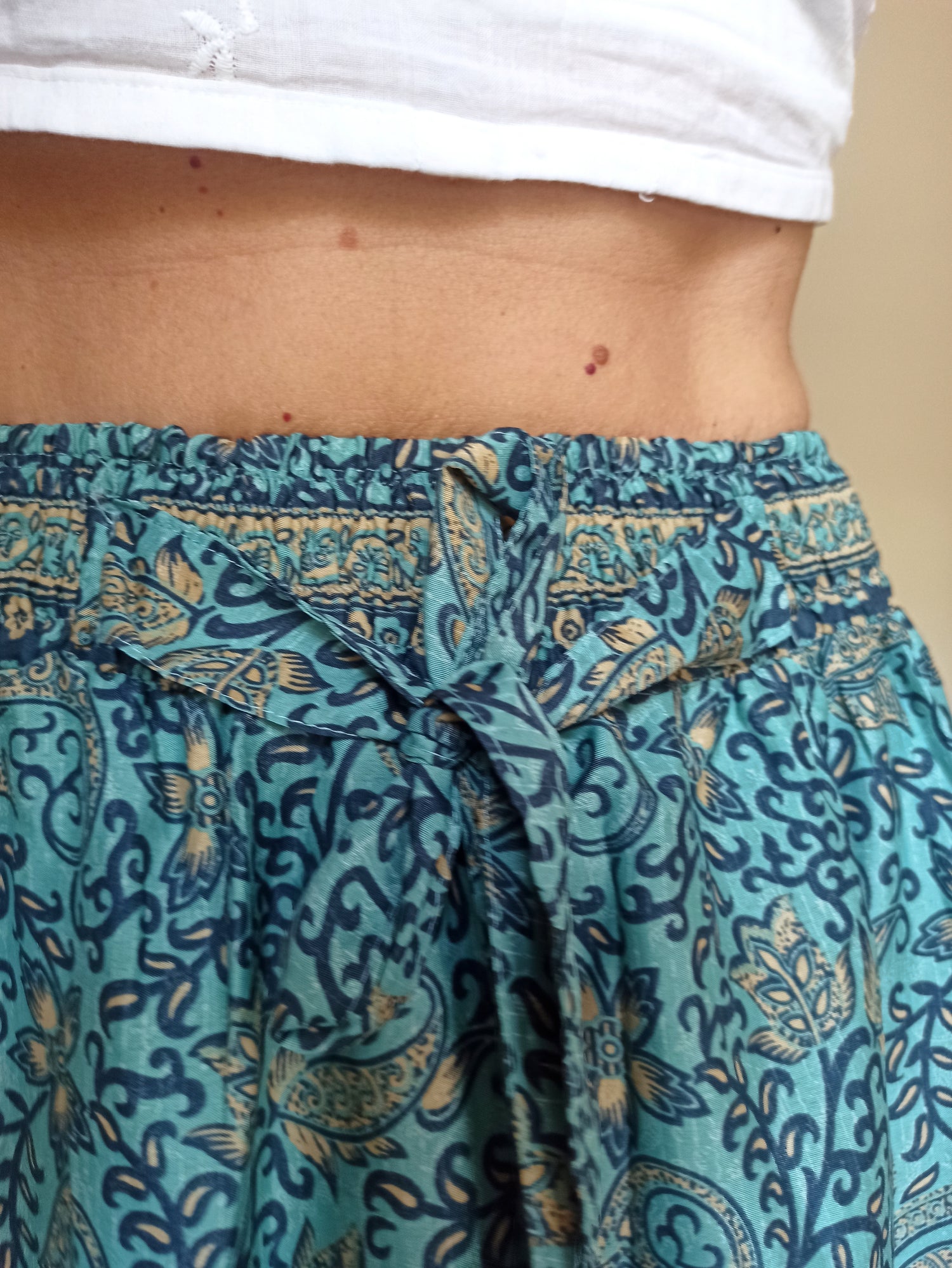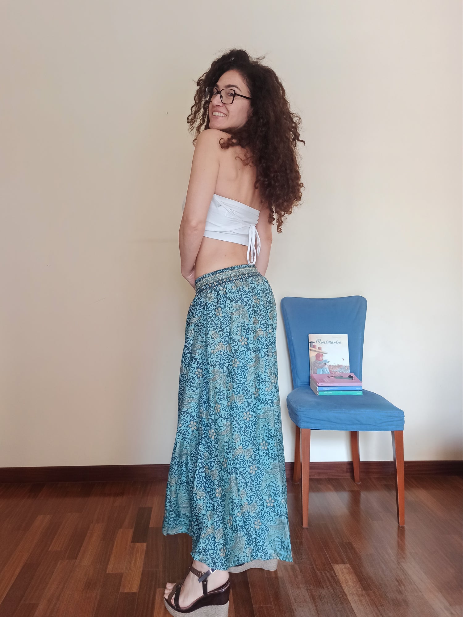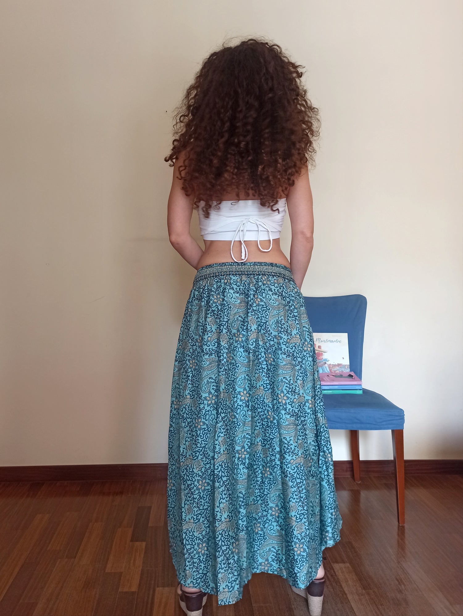 Dieser lange Rock im Gypsy-Stil verleiht Ihrer Garderobe einen wunderschönen Boho-Chic-Touch. Er besteht aus weichem, leichtem Stoff und verfügt über ein Blumenmuster in Grün- und Blautönen, perfekt für warmes Wetter.