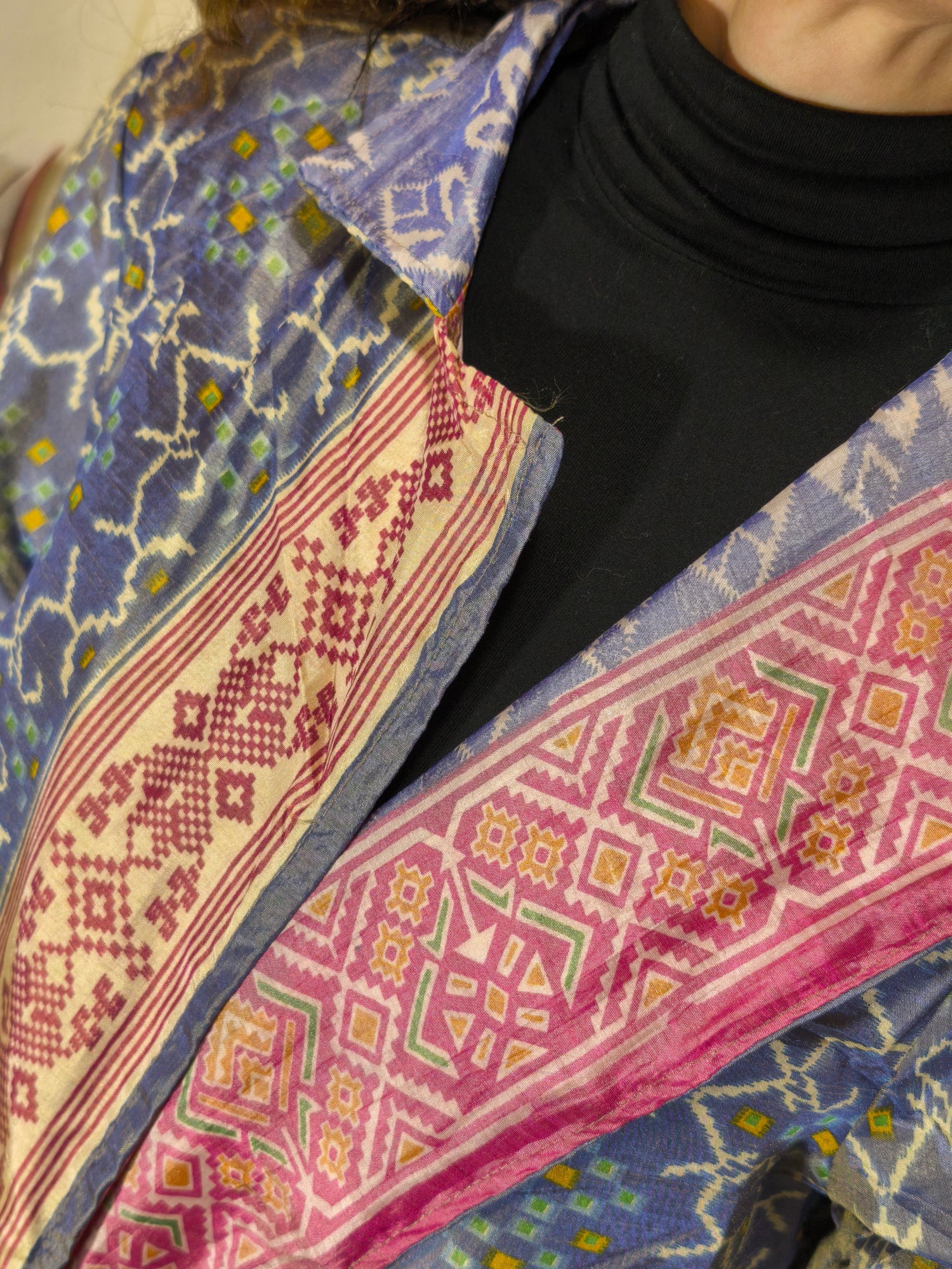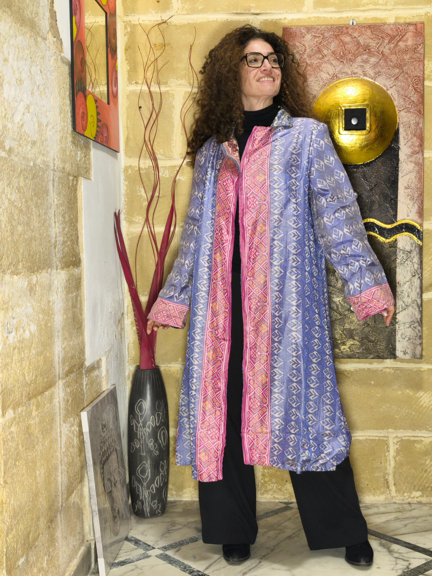 Questo kimono double face è un invito a esprimere il tuo stile in modo libero e autentico. Da un lato, una base fresca e intensa sui toni del lilla arricchita da motivi floreali ed etnici nei toni del burro che catturano lo sguardo e da una greca lungo tutti i perimetri nei toni del fucsia e senape. Dall’altro lato, una versione più vivace nelle sfumature del giallo e oro, con pattern delicati e armoniosi. Due atmosfere diverse, da indossare seguendo il tuo umore.