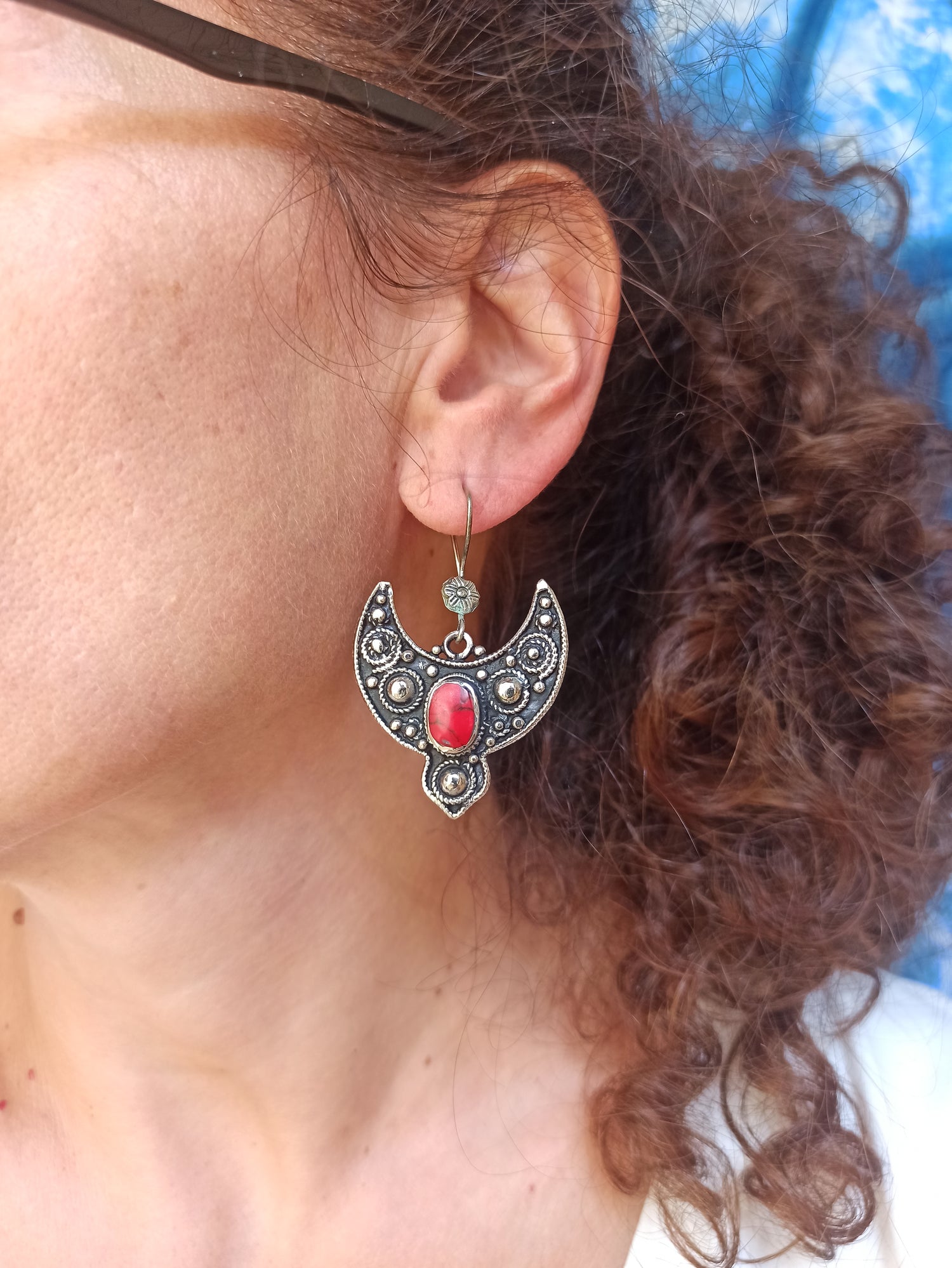 Vintage-Ohrringe aus Metall mit korallenfarbener Paste aus der Region Belutschistan zwischen Iran, Pakistan und Afghanistan.