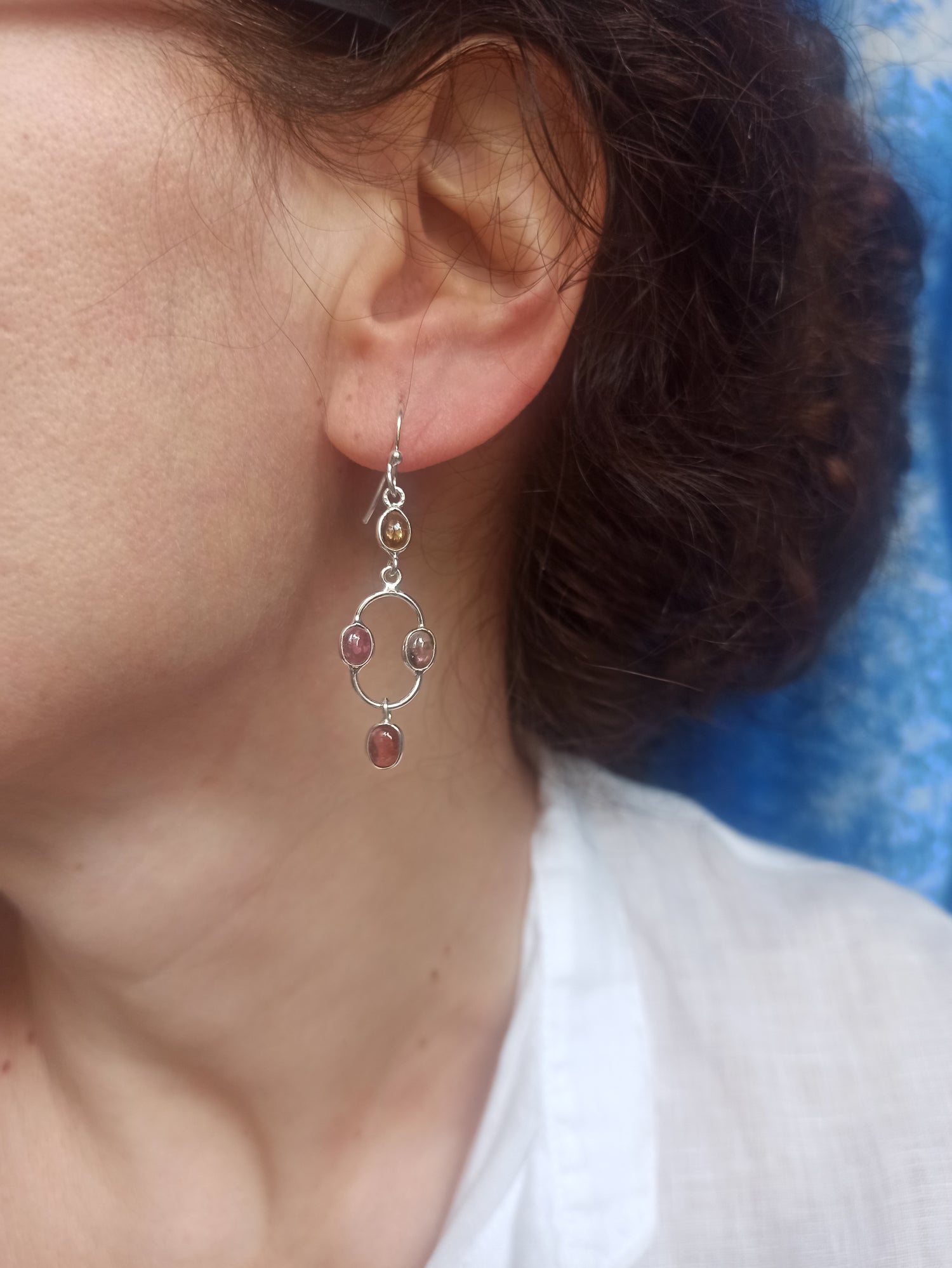 Ohrringe aus 925er Silber mit einem Turmalinstein , hergestellt von indischen Kunsthandwerkern. Länge 5 cm.