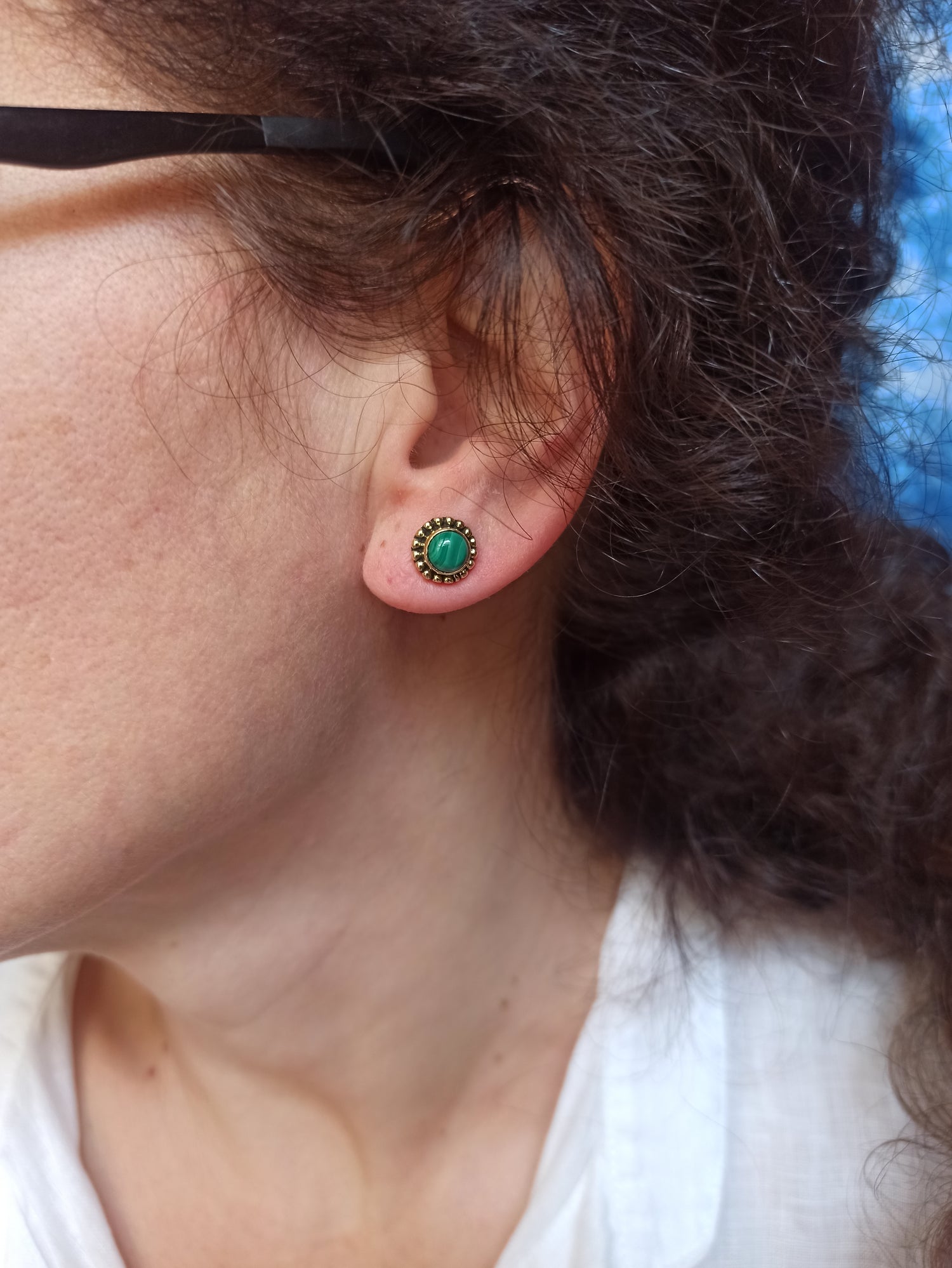 Ohrringe im Boho-Stil aus hypoallergenem Messing mit malachitähnlichem Einsatz.