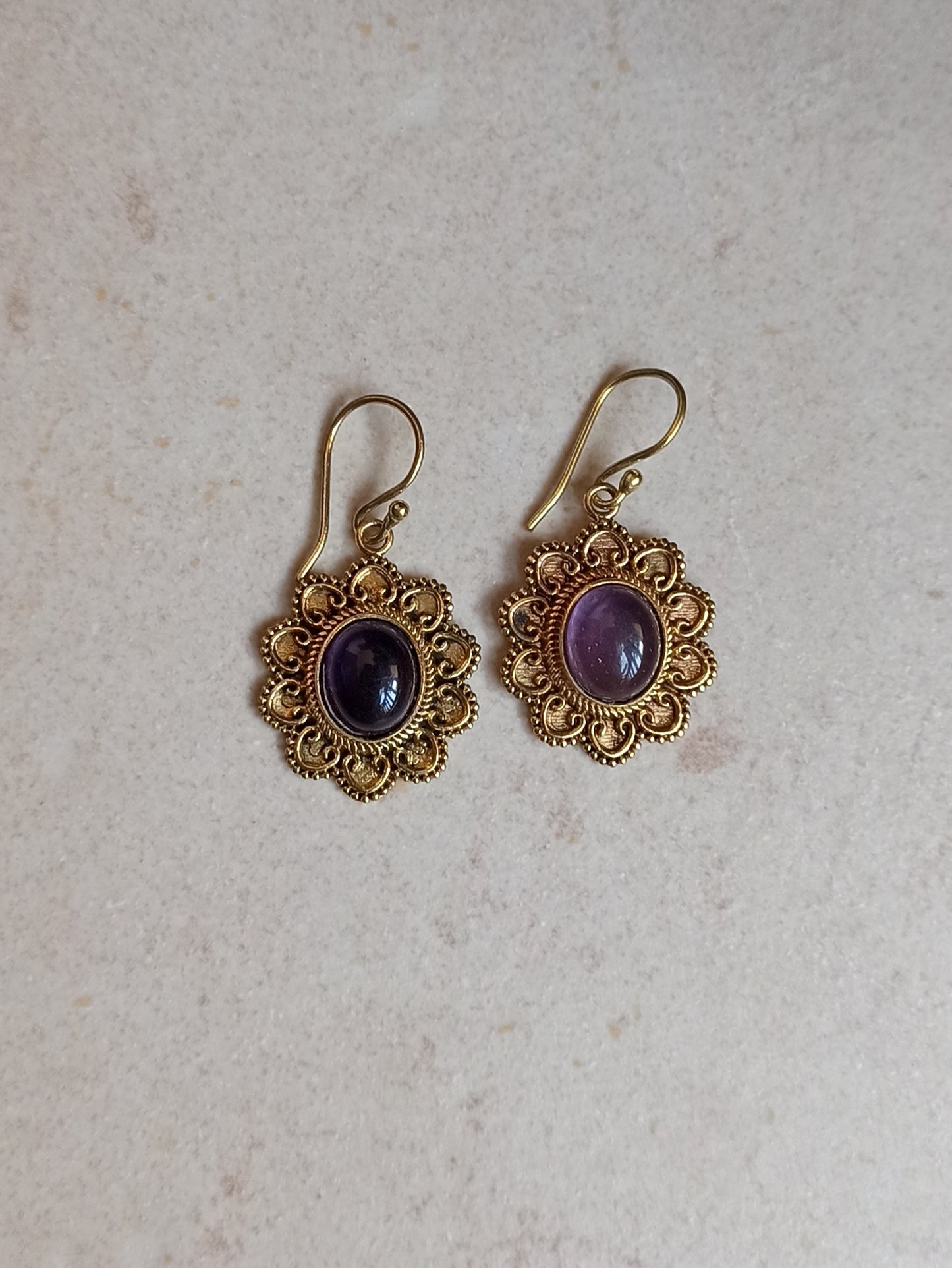Ohrringe aus hypoallergenem Goldmessing mit amethystähnlichem Harz.