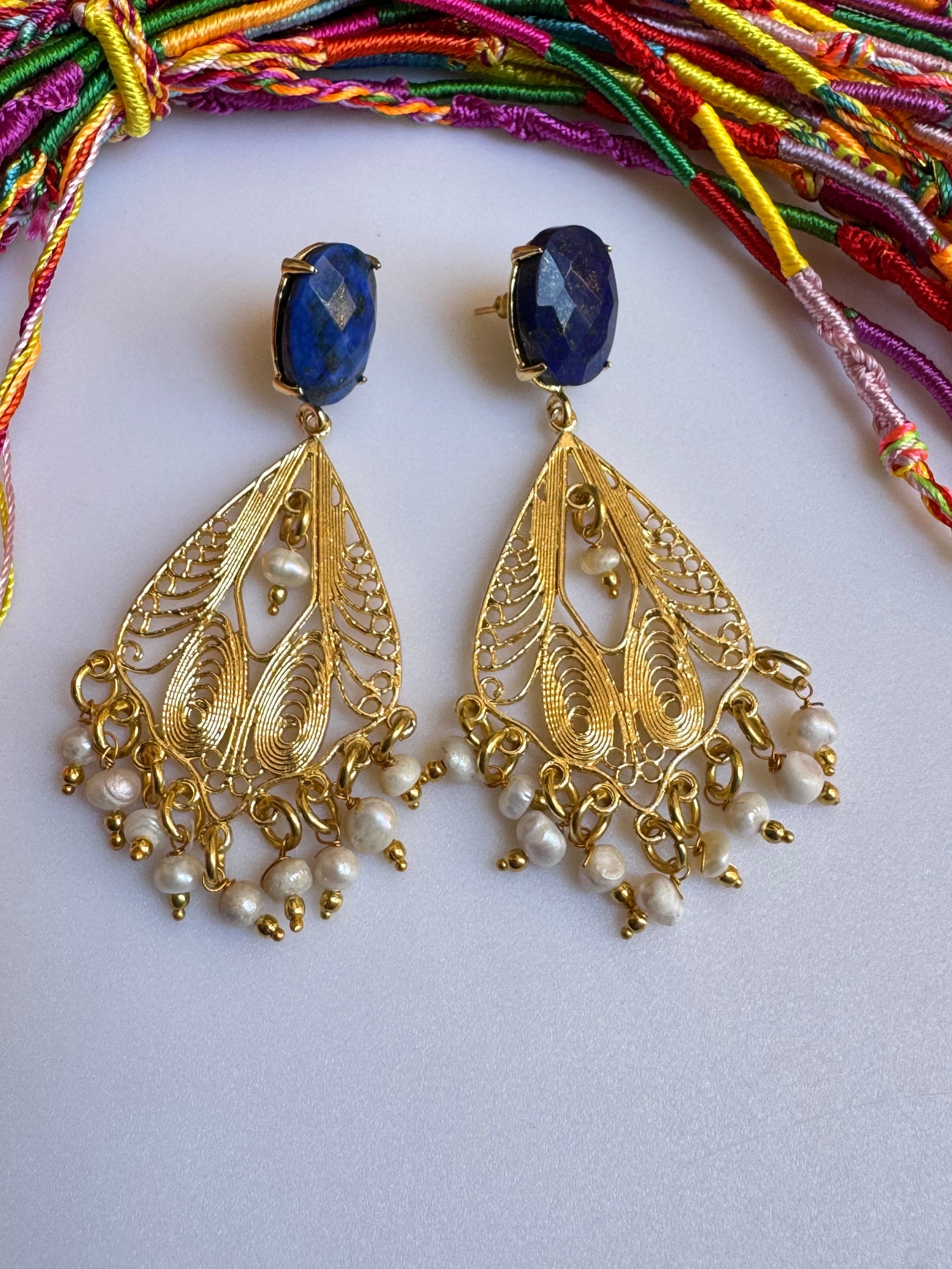 Vergoldete Ohrringe mit blauem Filigran und weißen Perlen