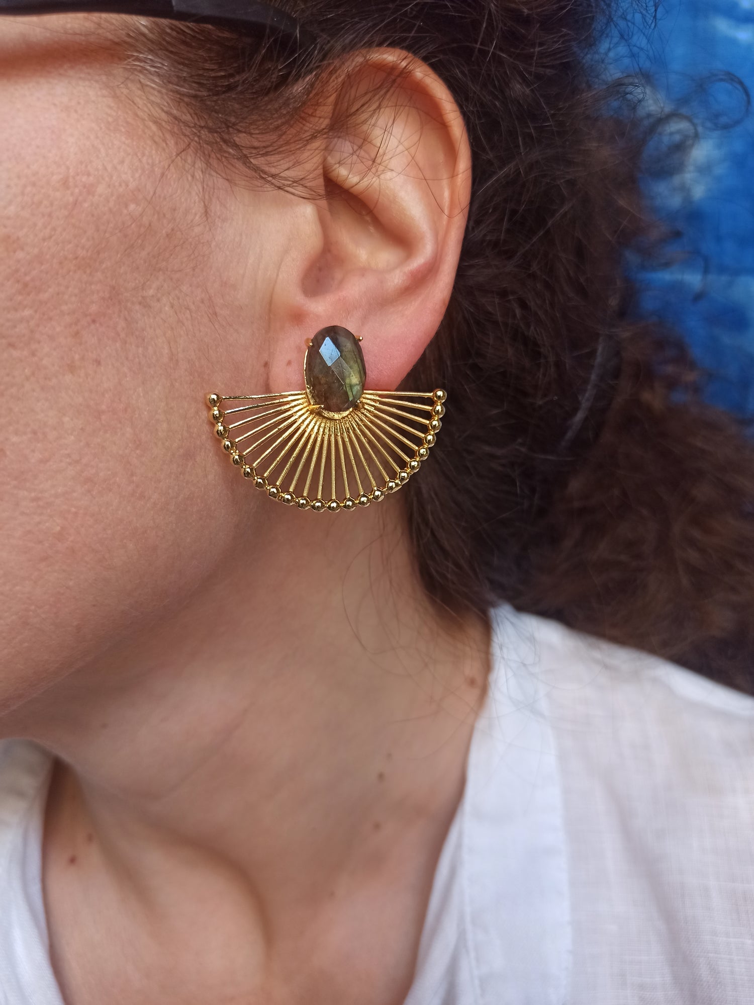Tropfenohrringe aus vergoldeter Metalllegierung, verziert mit einer labradoritähnlichen Applikation.