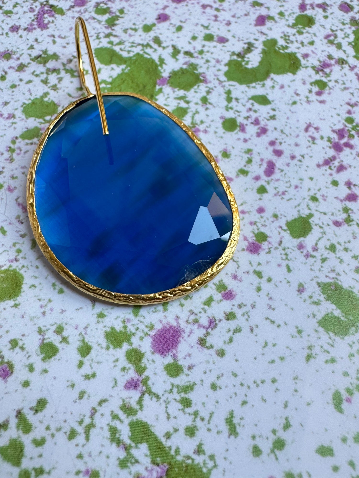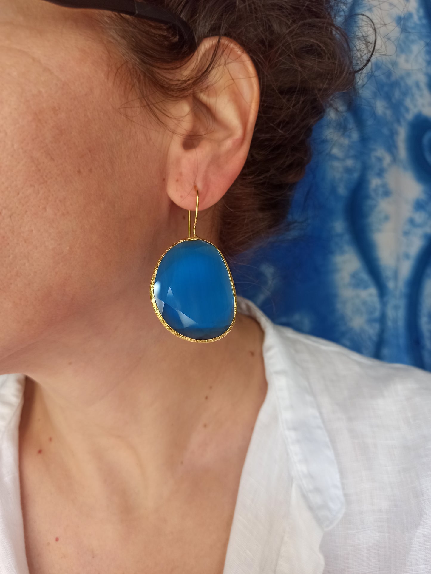 Hypoallergene Messingohrringe mit einem von Hand eingesetzten Katzenaugenstein. Länge ca. 6cm.