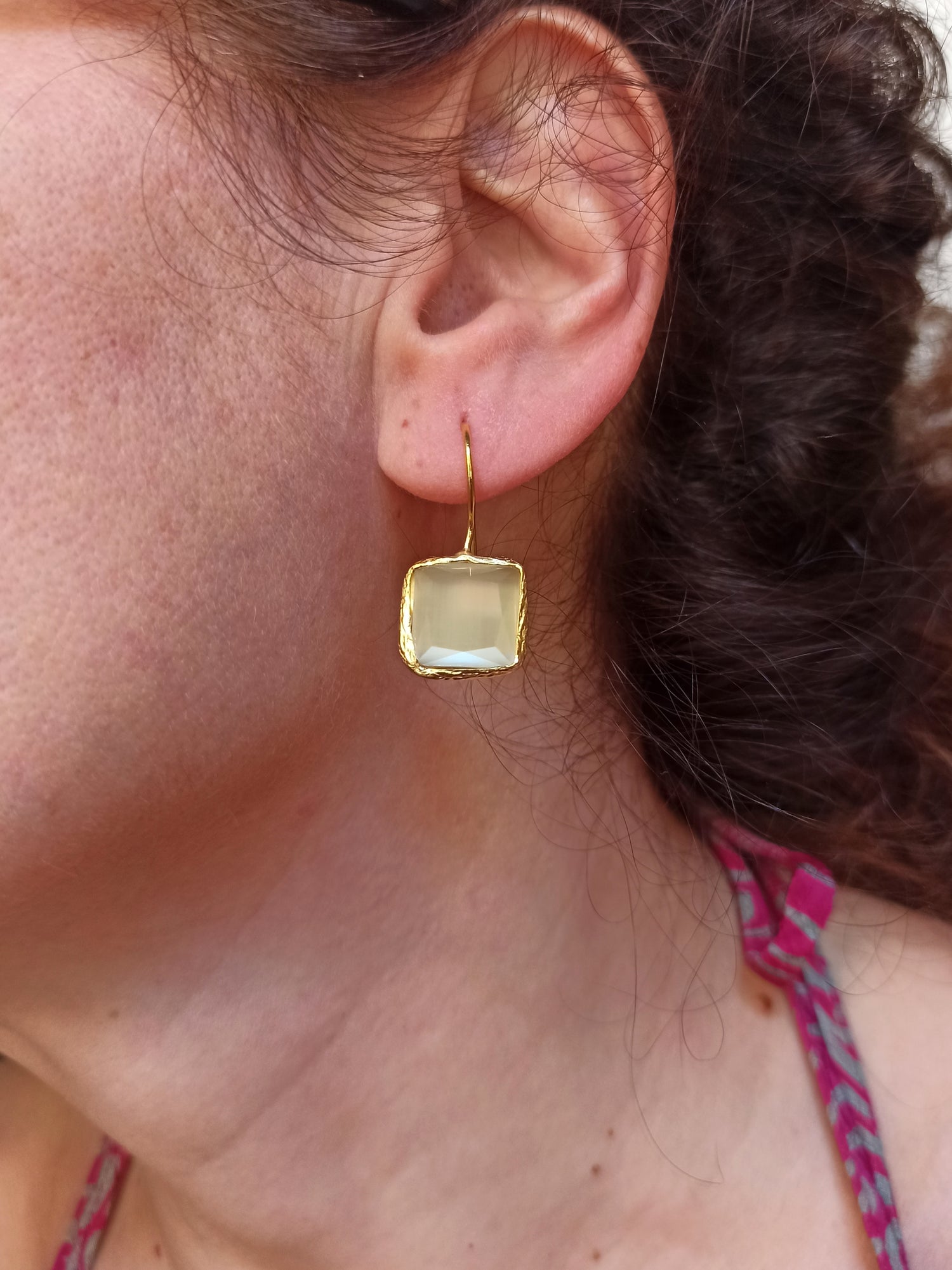 Hypoallergene Messingohrringe mit weißem Katzenaugenstein. Nickelfrei.