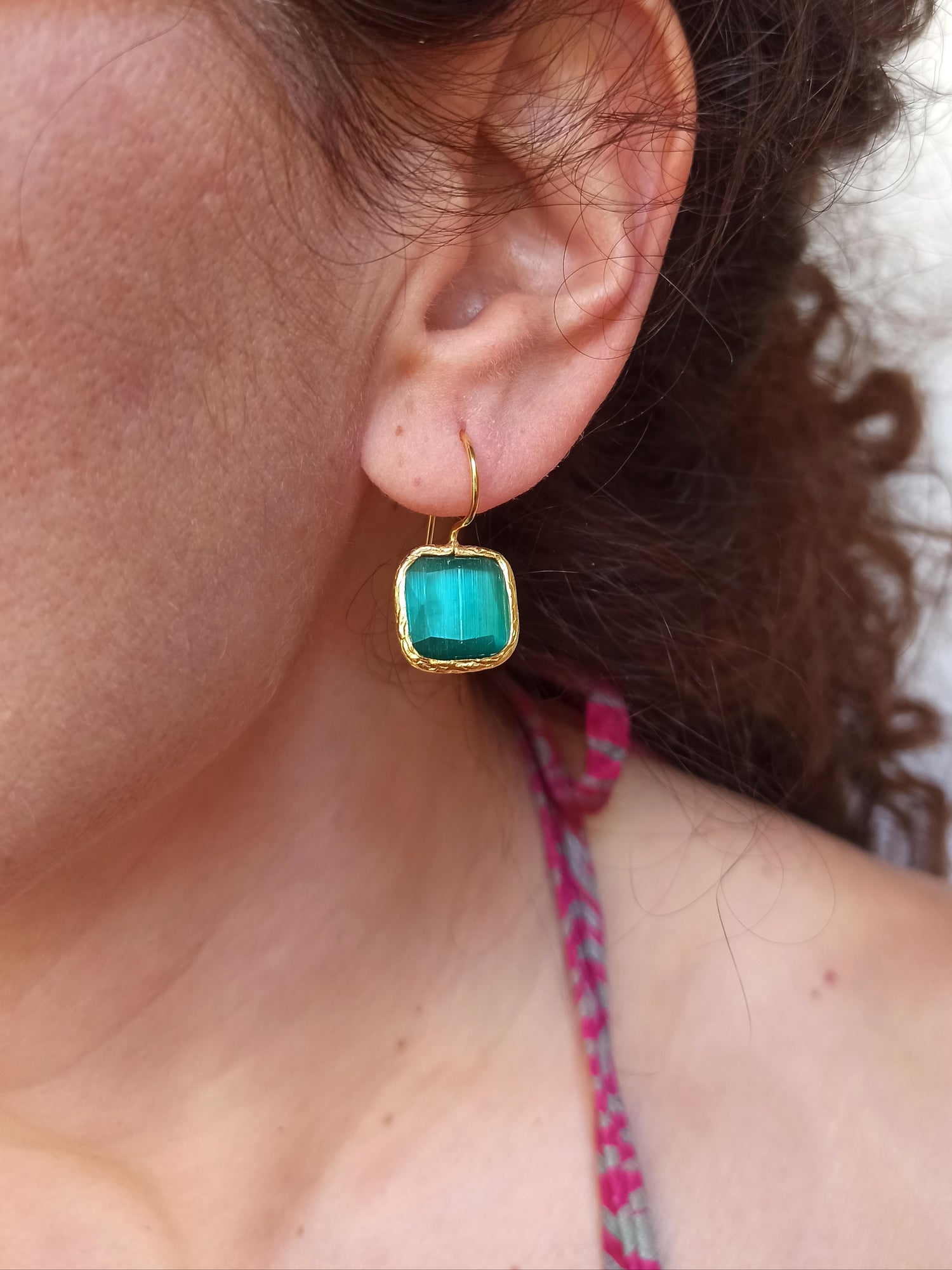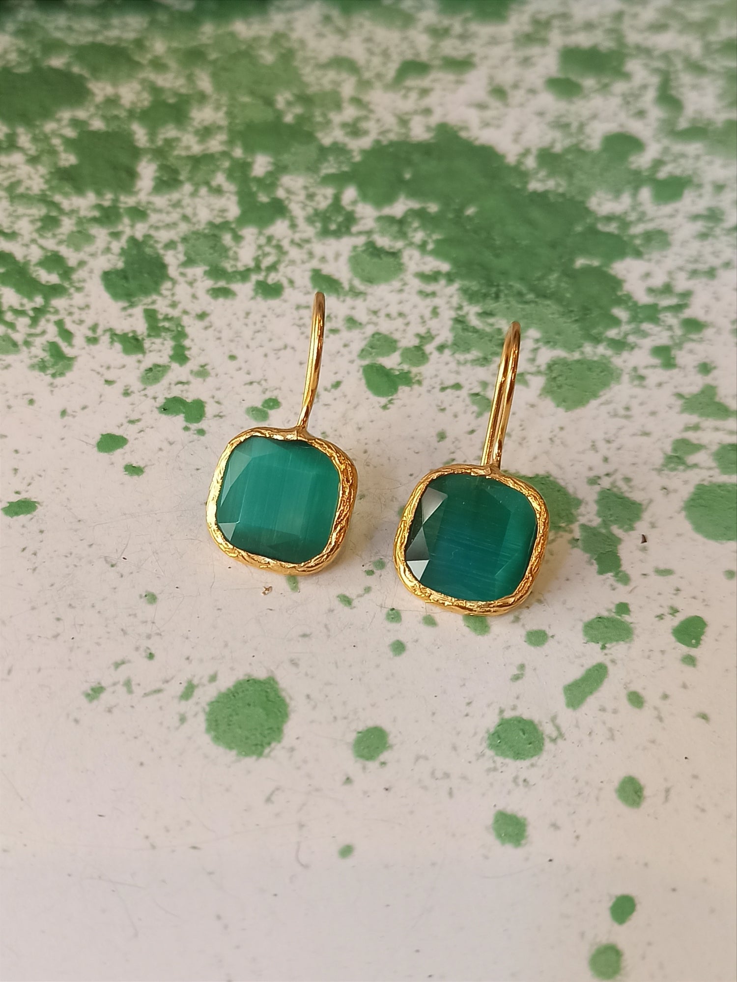 Hypoallergene Messingohrringe mit flaschengrünem Katzenaugenstein. Nickelfrei.