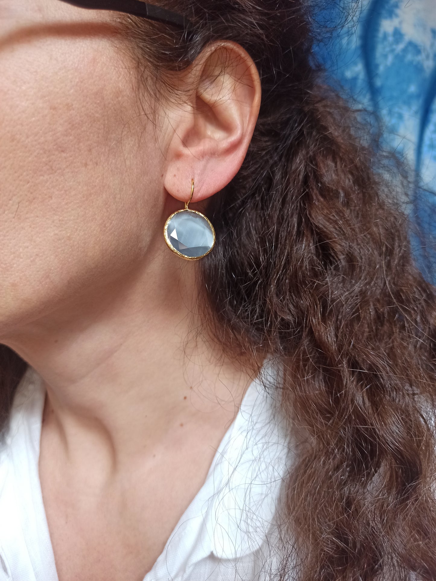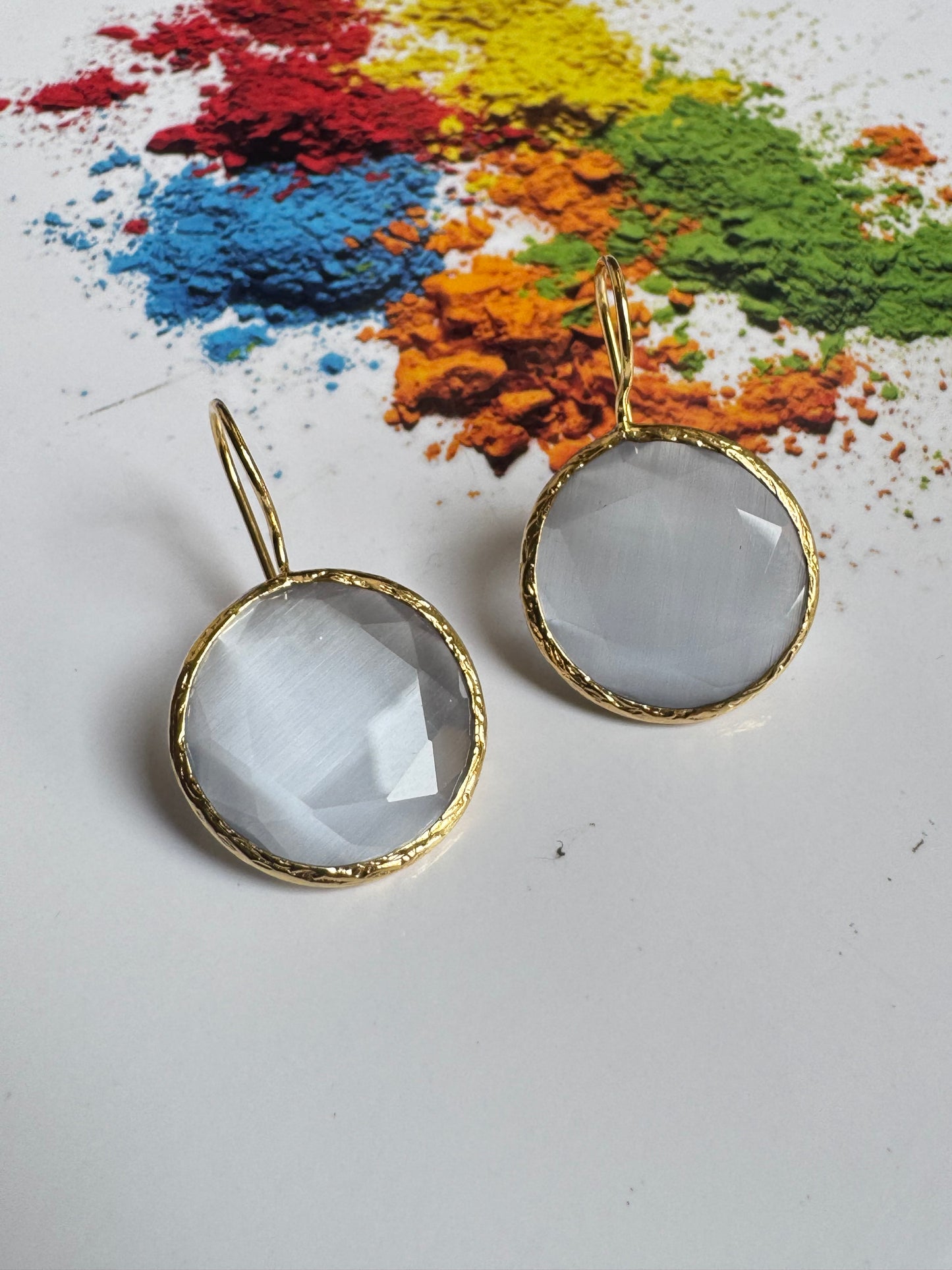 Hypoallergene Messingohrringe mit Katzenaugenstein. Länge 3,5 cm. Steindurchmesser 2cm.