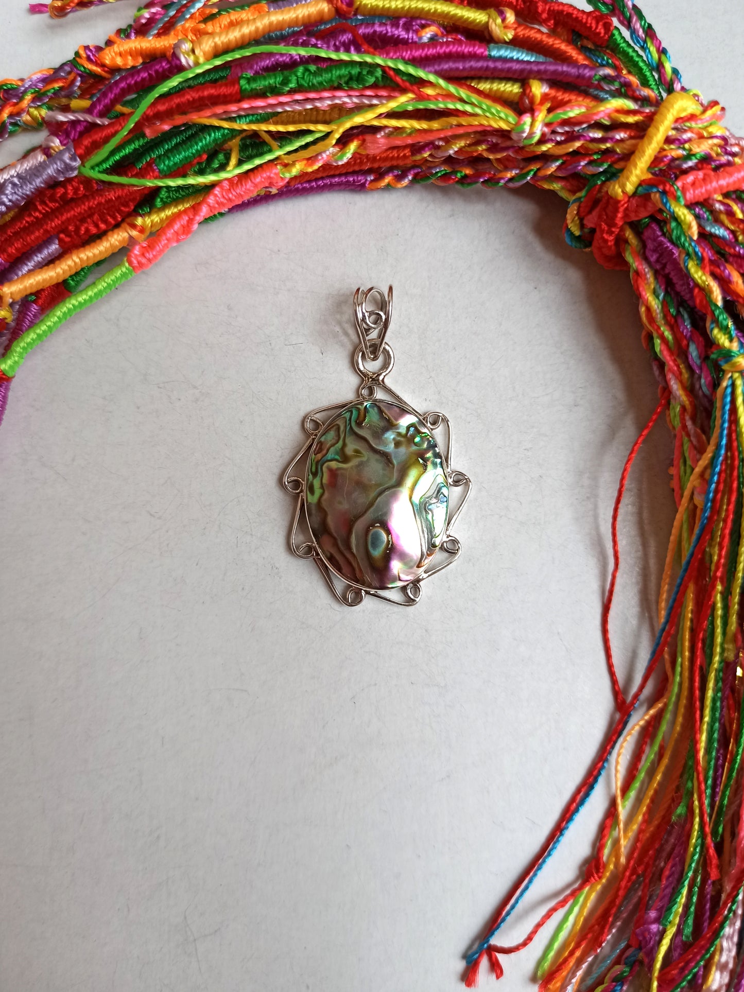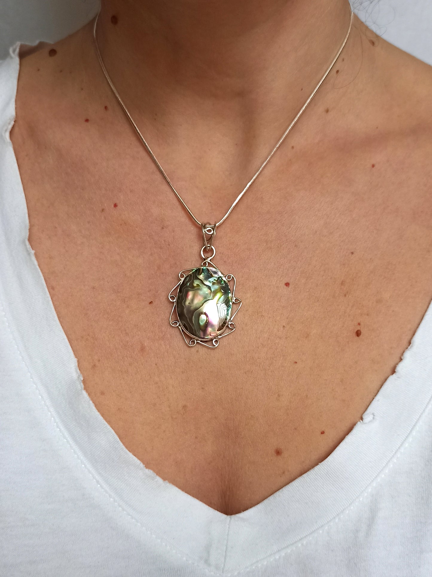 Anhänger aus 925er Silber mit einem Tropfen Abalone. Abalone ist ein Weichtier mit einem einzigen, aber schönen Perlmuttpanzer, dessen Form einer Ohrmuschel ähnelt. Aus diesem Grund wird dieses Produkt auch Venusohr oder Meeresohr genannt .