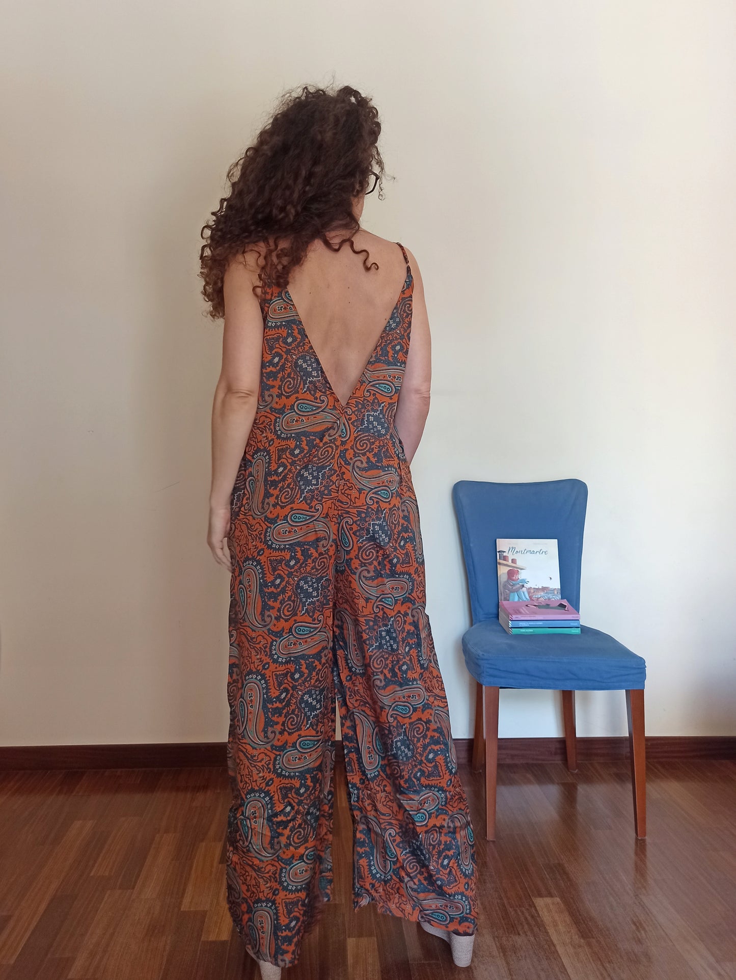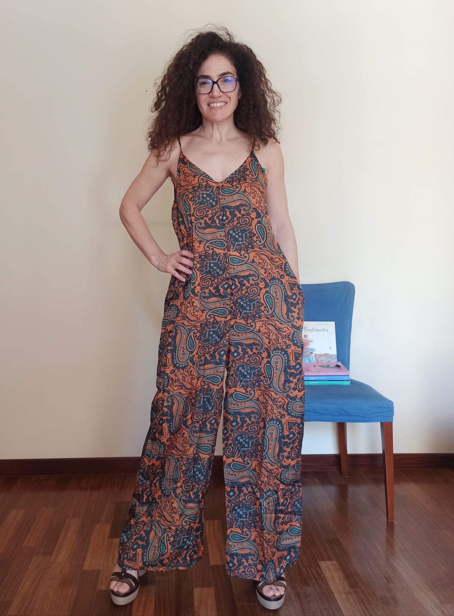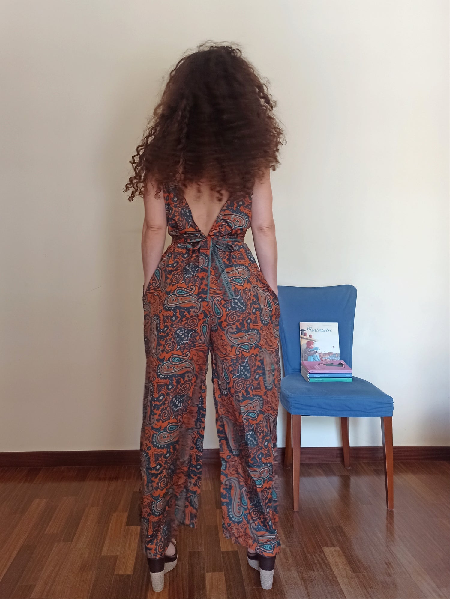 Leicht, raffiniert und perfekt für den Sommer: Dieser lange Jumpsuit ist ein vielseitiges Kleidungsstück, das Eleganz und Funktionalität vereint. Er ist aus weichem, atmungsaktivem Stoff gefertigt und besticht durch einen lebendigen Ethno-Print in warmen Siena- und Marineblautönen, akzentuiert durch zarte Akzente in Puderblau und Hellweiß, die ihm einen Boho-Chic-Look verleihen.