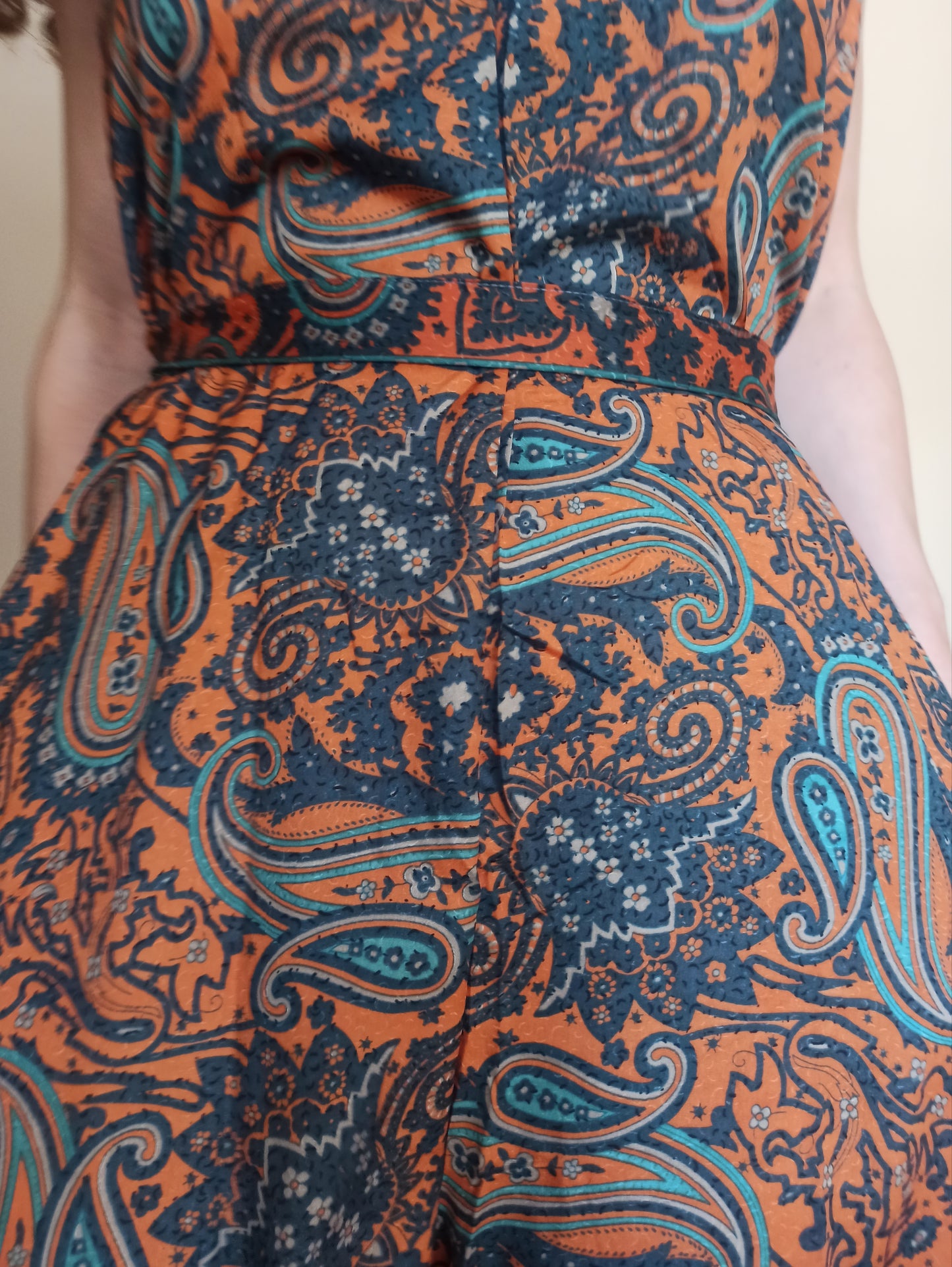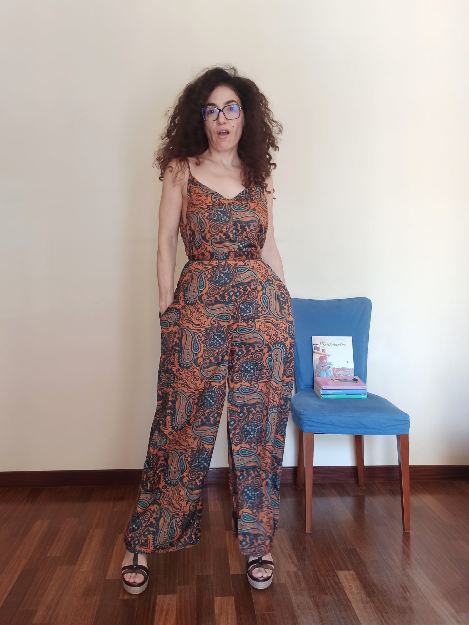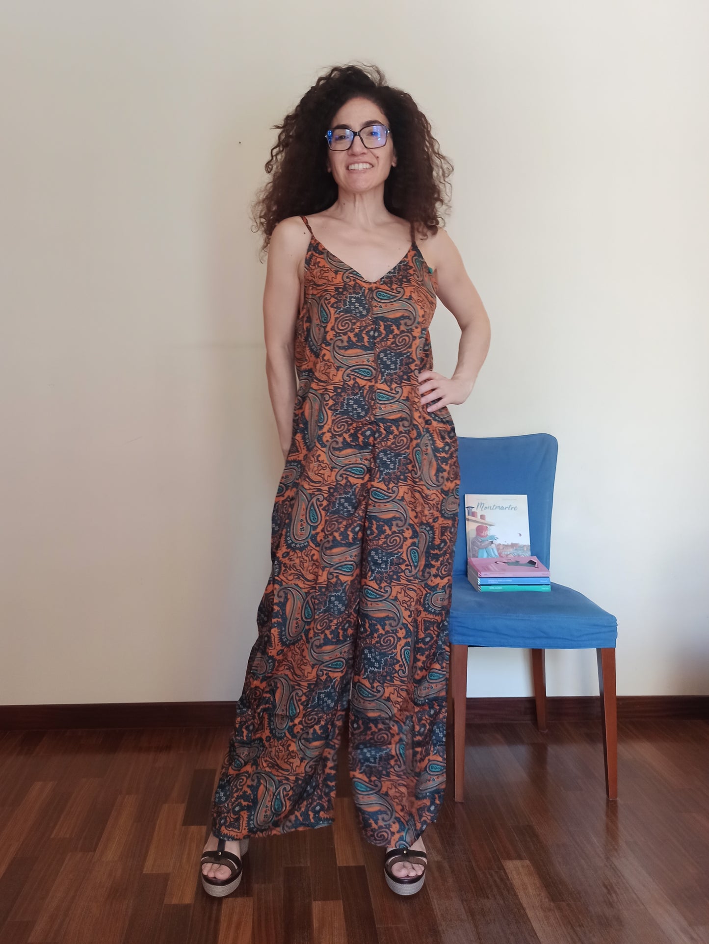 Leicht, raffiniert und perfekt für den Sommer: Dieser lange Jumpsuit ist ein vielseitiges Kleidungsstück, das Eleganz und Funktionalität vereint. Er ist aus weichem, atmungsaktivem Stoff gefertigt und besticht durch einen lebendigen Ethno-Print in warmen Siena- und Marineblautönen, akzentuiert durch zarte Akzente in Puderblau und Hellweiß, die ihm einen Boho-Chic-Look verleihen.