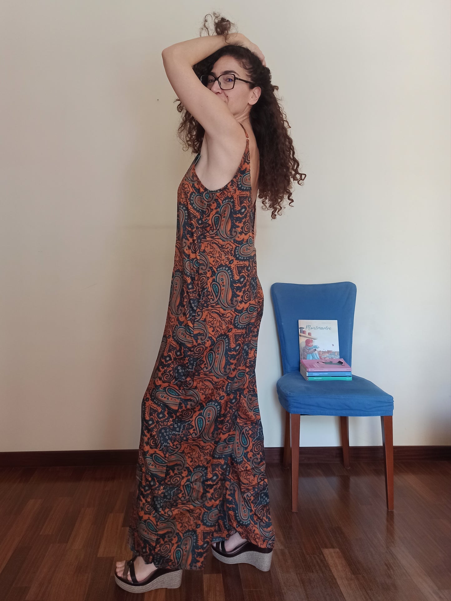 Das ärmellose Design zeichnet sich durch dünne Träger aus, die die Schultern betonen, während der V-Ausschnitt und der tiefe V-Rücken einen Hauch von Sinnlichkeit und Weiblichkeit verleihen. Die weite, fließende Linie der Beine sorgt für Komfort und Bewegungsfreiheit und macht das Kleid perfekt für Sommertage und entspannte Abende im Freien.