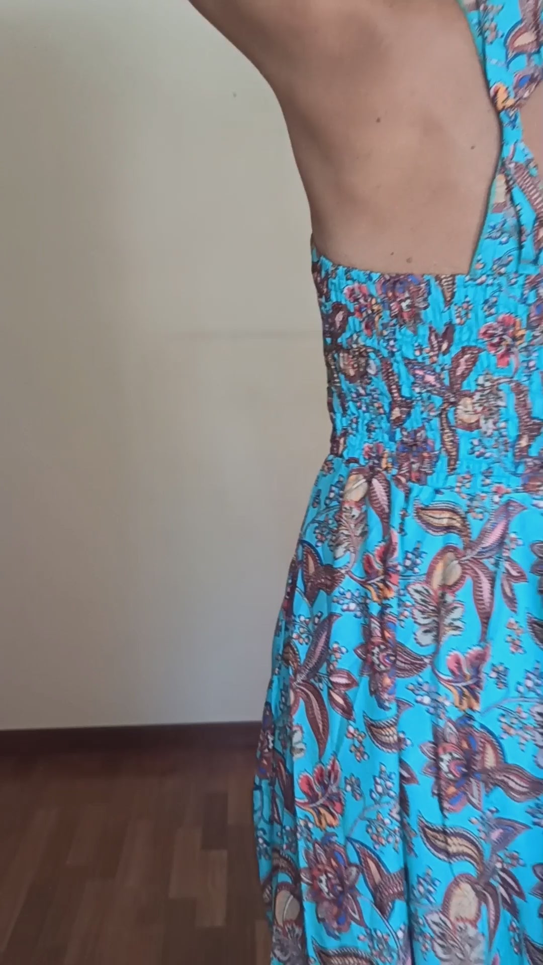 Genießen Sie die Eleganz dieses ätherischen und femininen langen Kleides im Boho-Chic-Stil. Es ist aus leichtem, fließendem Stoff gefertigt und besticht durch ein buntes Blumenmuster auf meerblauem Grund. Der tiefe V-Ausschnitt und die Empire-Taille des Oberteils sind mit einem kontrastierenden griechischen Schlüsselloch verziert, das die Silhouette betont. Der Rücken besticht durch bezaubernde gekreuzte Träger und eine figurbetonte Passform ab der Taille, bevor er sich in einen weiten, fließenden Rock öffnet, der Ihren Bewegungen mühelos folgt.
