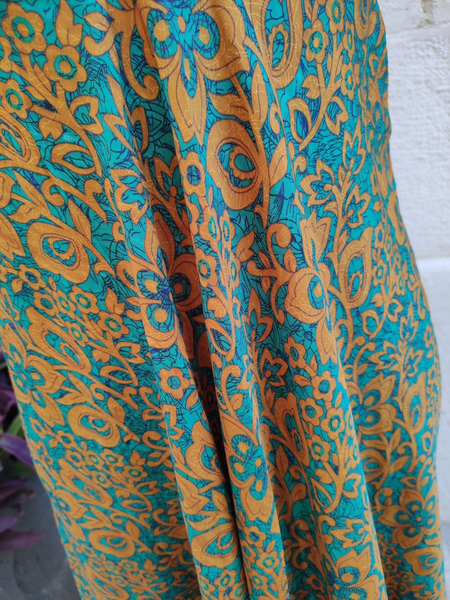 Boho Long Dress – Green and Ochre Floral Pattern