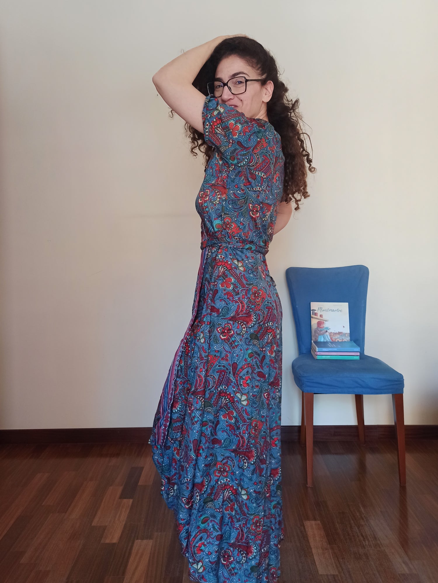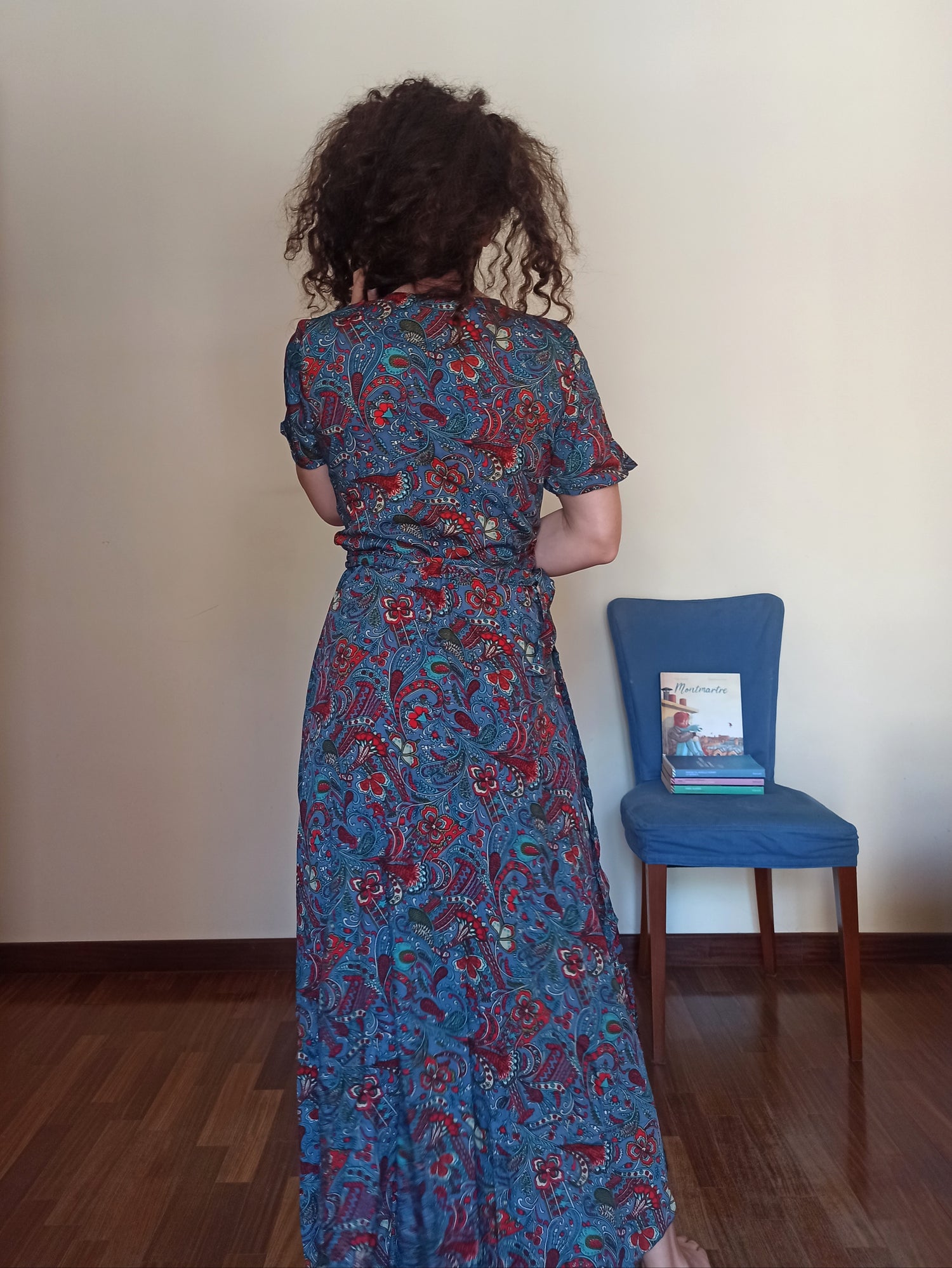 This wrap dress captivates with its casual elegance and paisley pattern in vibrant blue, red, and green, intertwining in a rich and refined design. The wrap-over design, with a tie waist, flatters every figure thanks to its adaptability and feminine line that hugs the body without constricting. The V-neck delicately frames the décolleté, while the short sleeves offer comfort and freshness.