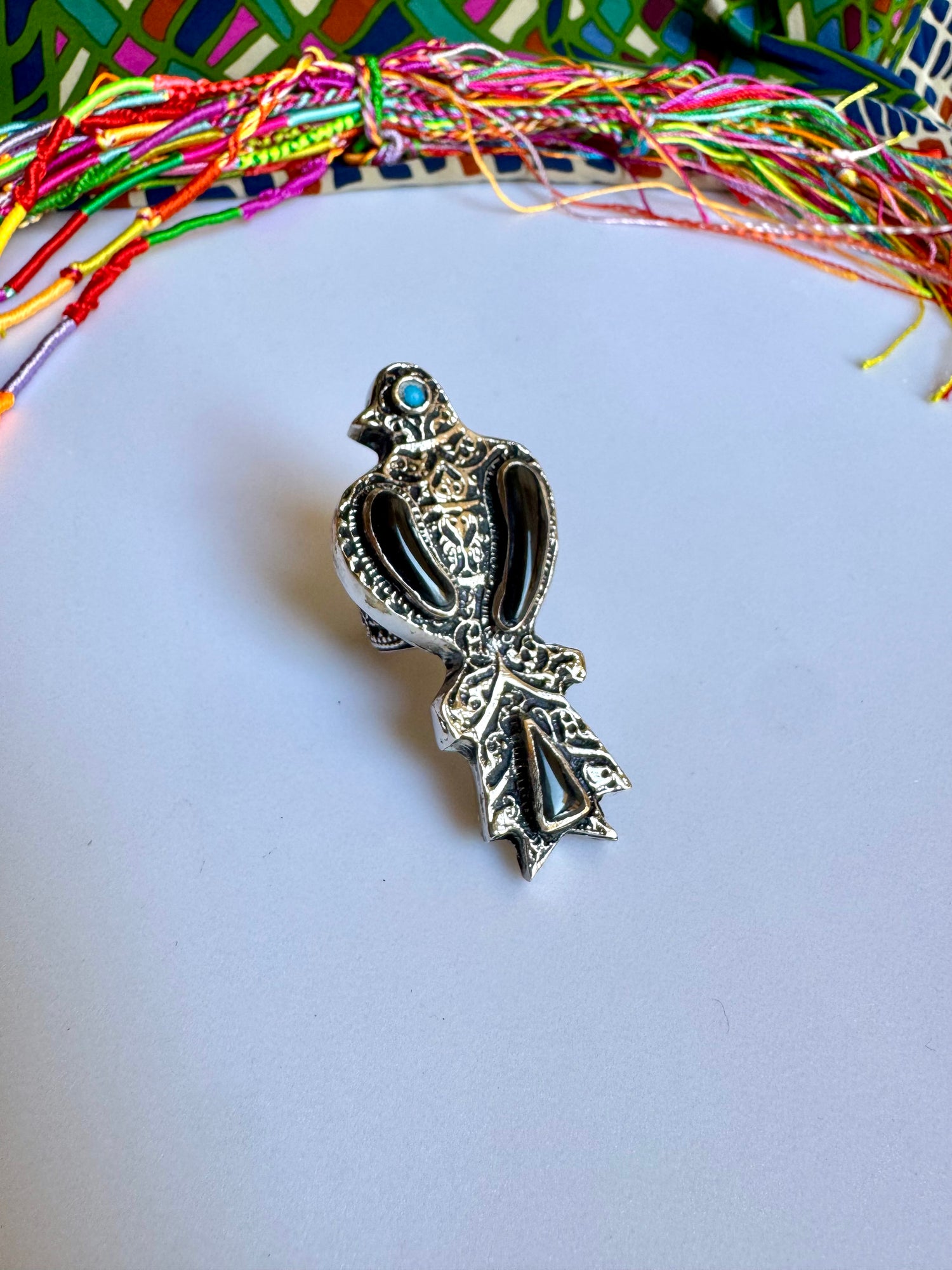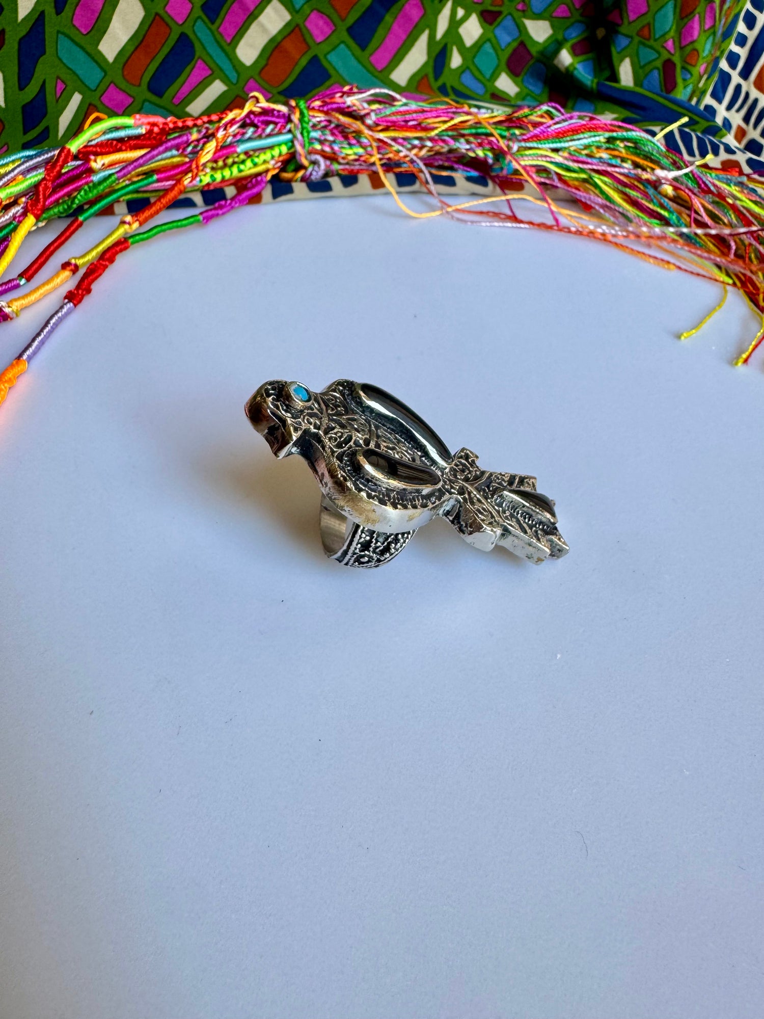 This charming handcrafted Afghan ring is crafted from hand-worked silver and embellished with black agate, with a small turquoise detail adorning the bird's head. Its elongated, sculptural shape recalls the traditional style of Central Asian goldsmiths, where the combination of chiseled metal and natural stones is a distinctive feature.