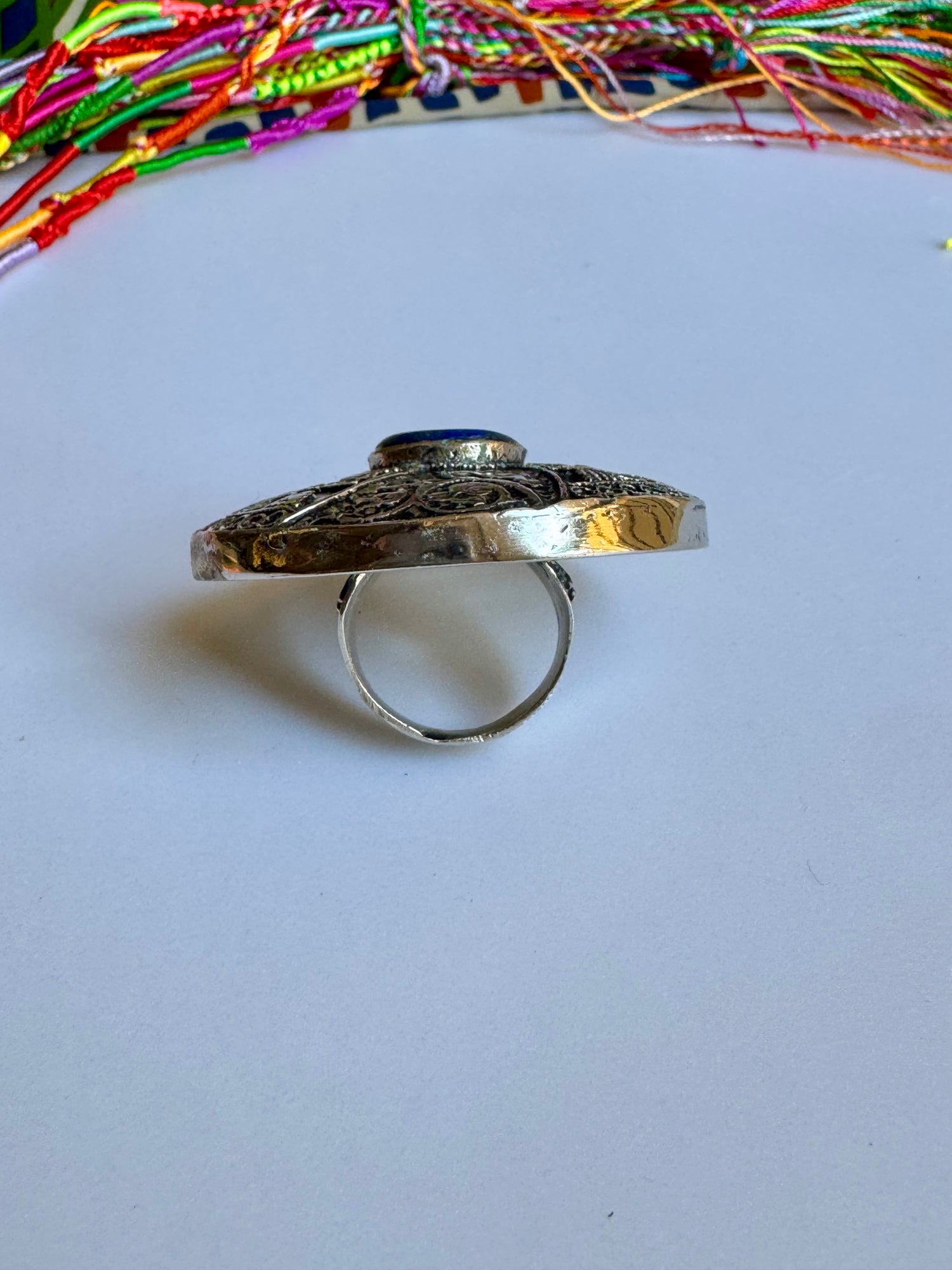 At the center stands out an intense blue stone, typical of Afghan production, prized for its deep color and symbolically associated with wisdom, calm, and spiritual protection.