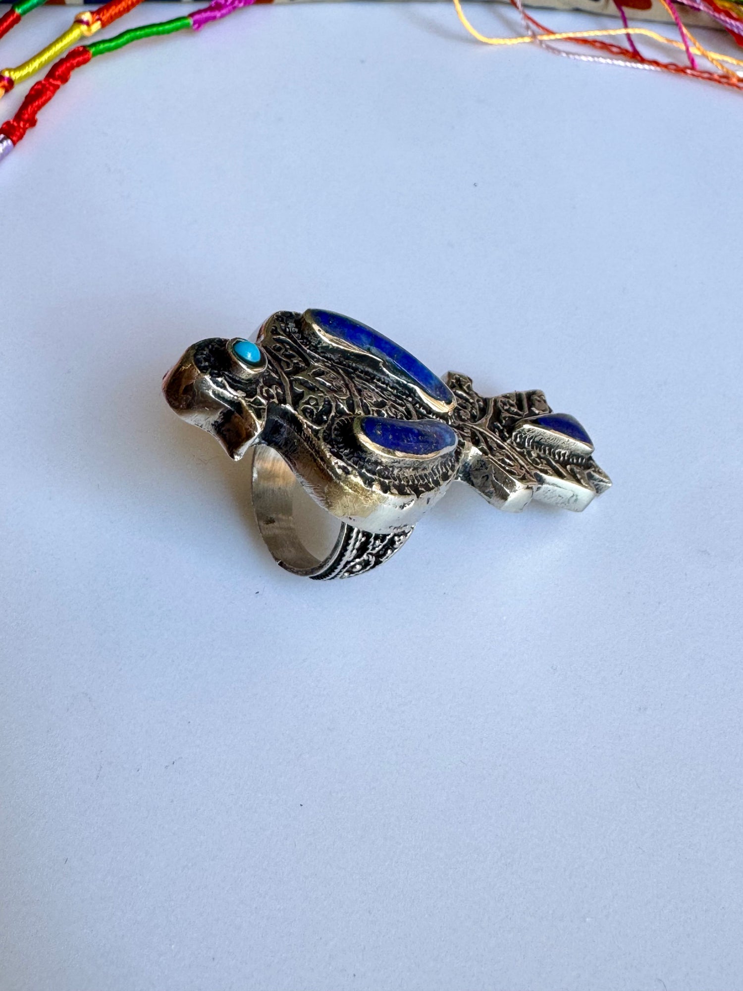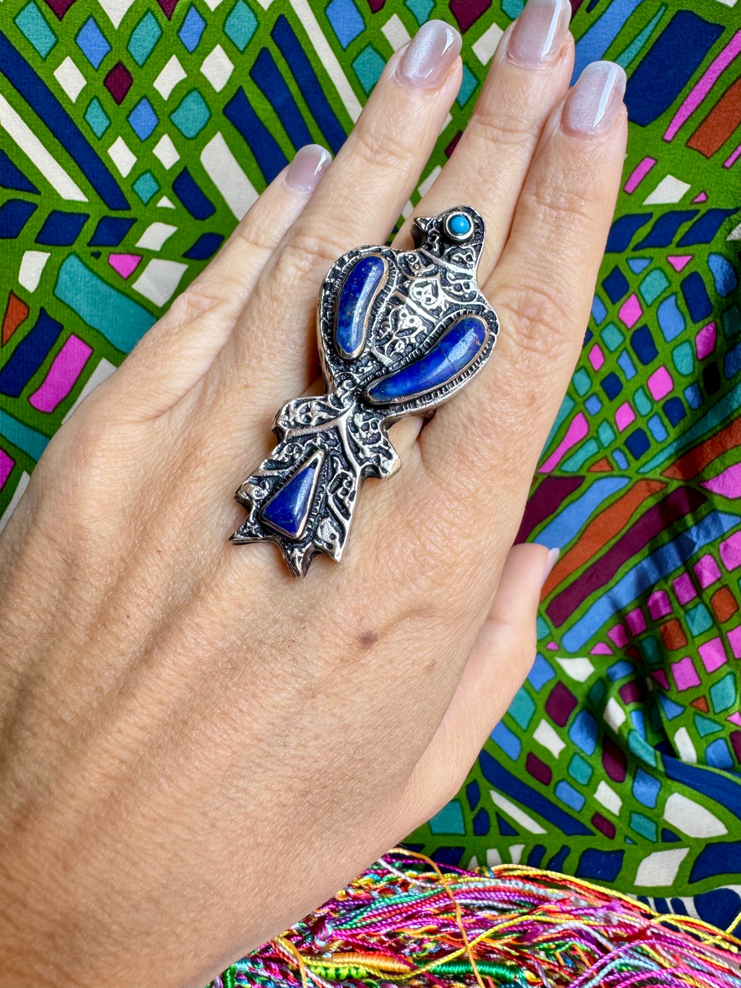 This charming handcrafted Afghan ring is crafted from hand-worked silver and embellished with deep blue lapis lazuli paste, with a small turquoise detail adorning the bird's head. Its elongated, sculptural shape recalls the traditional style of Central Asian goldsmiths, where the combination of chiseled metal and natural stones is a distinctive feature.