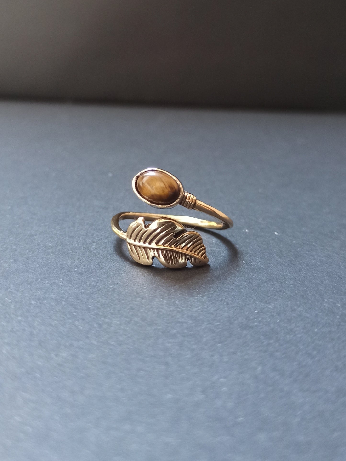 Hypoallergenic golden brass ring with tiger's eye. Adjustable.