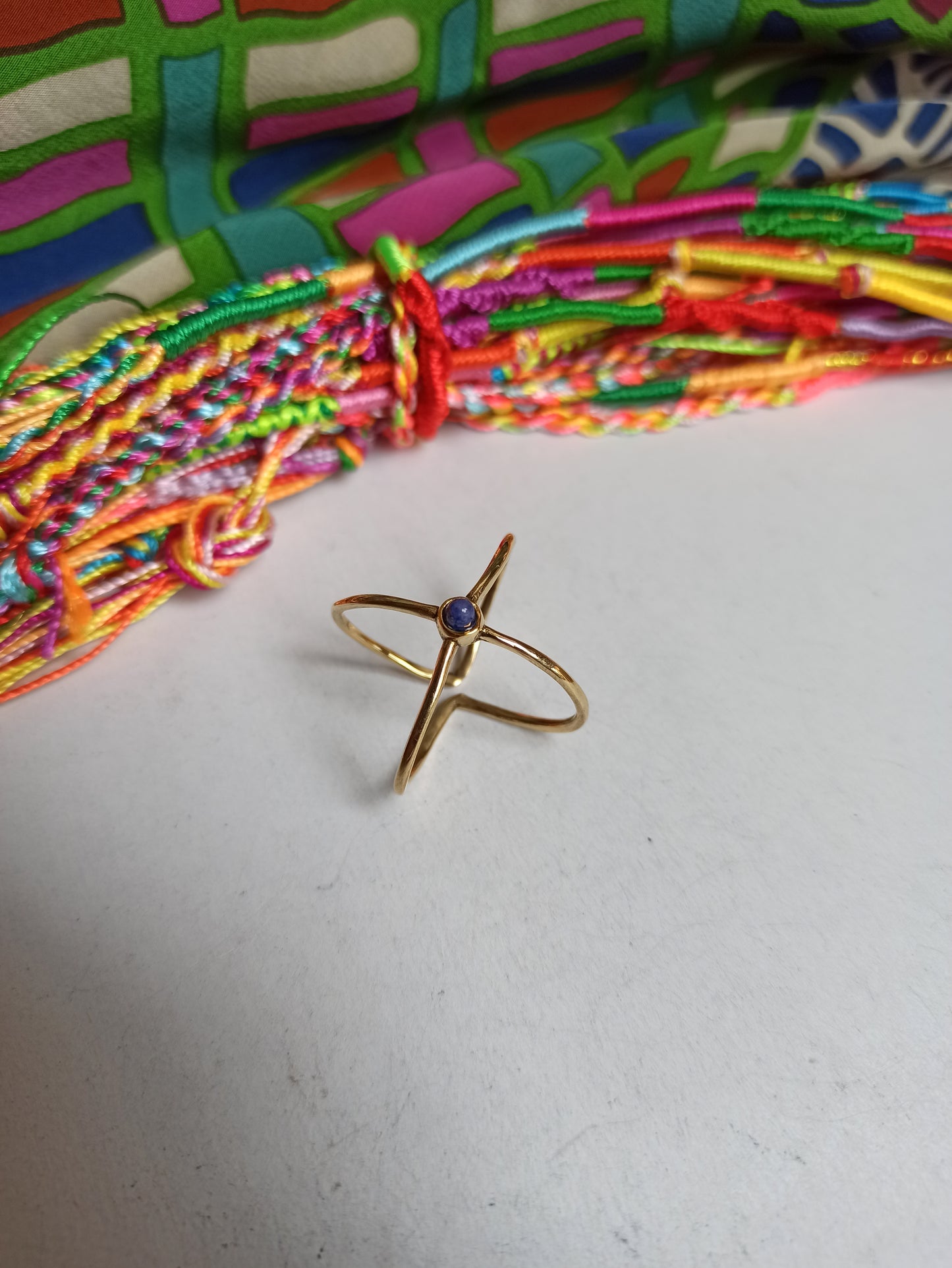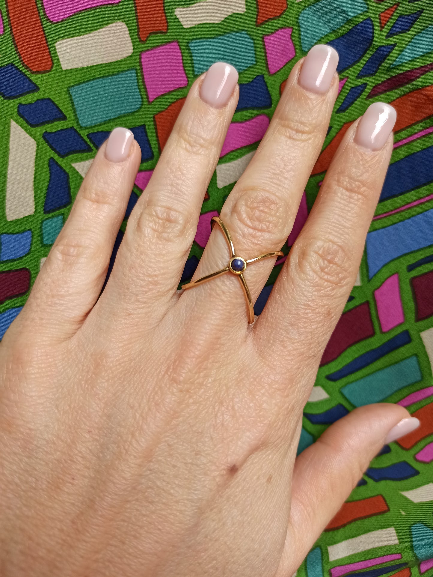 Hypoallergenic golden brass ring with lapis. Adjustable.