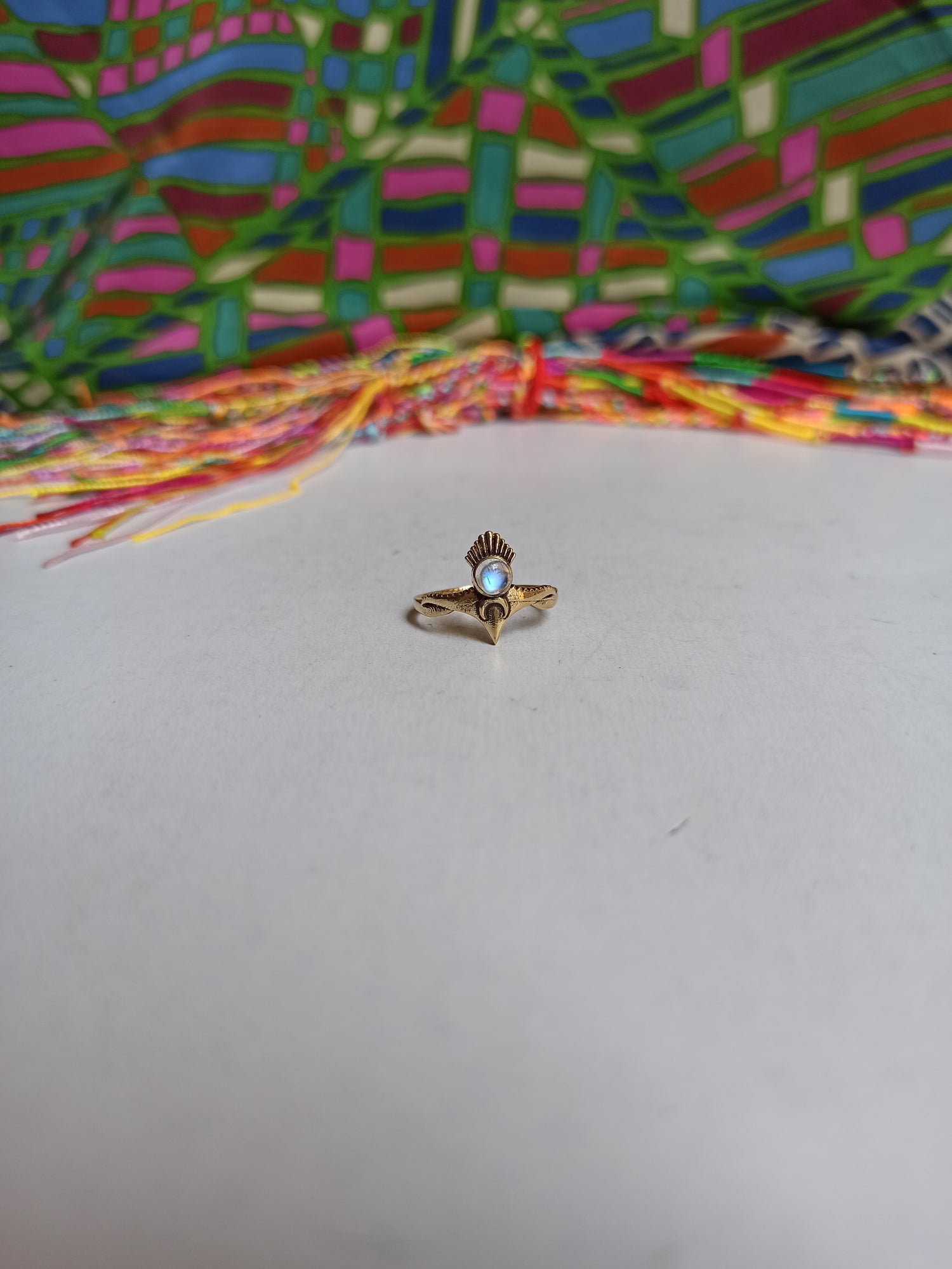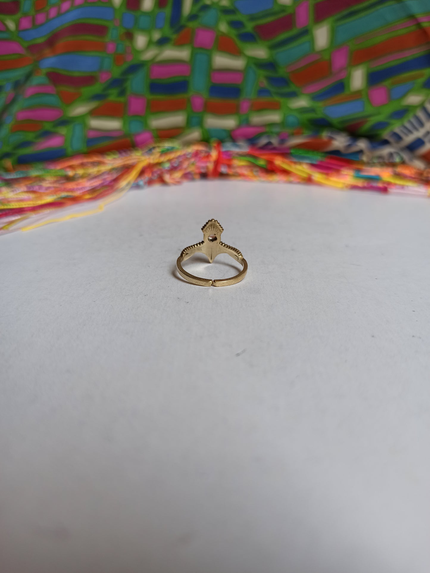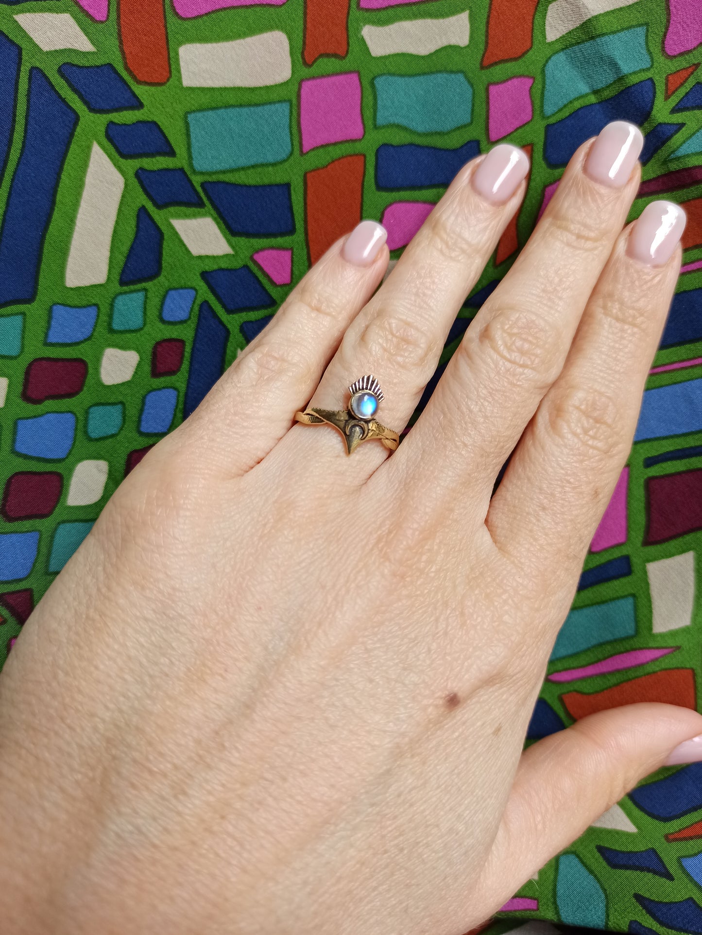 Hypoallergenic gold plated brass ring with labradorite-like application. Adjustable.