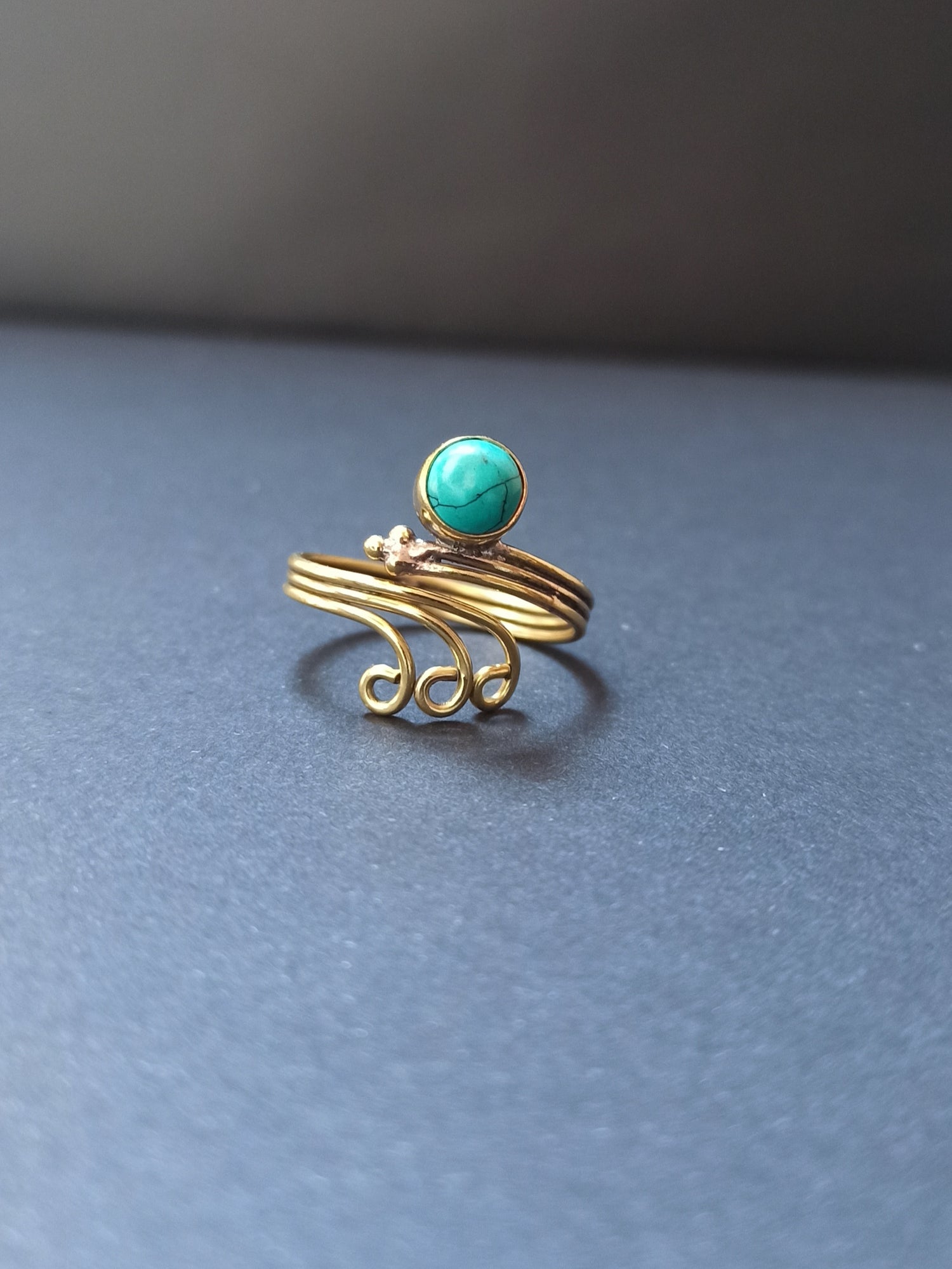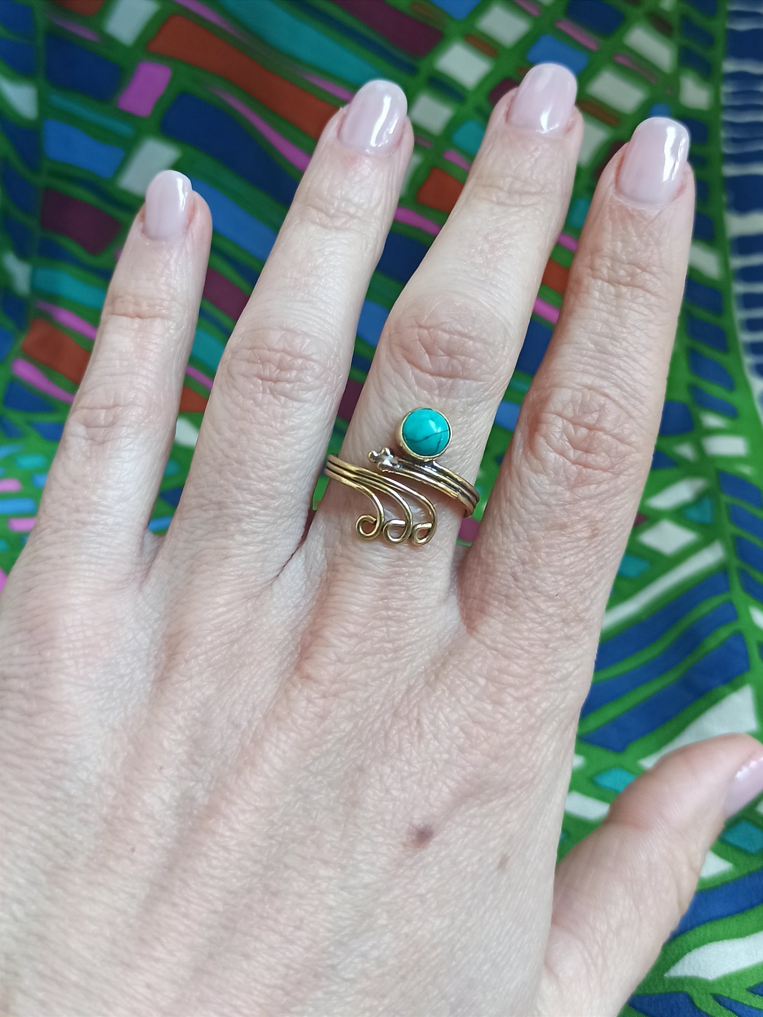 Hypoallergenic golden brass ring with turquoise-like resin. Adjustable.