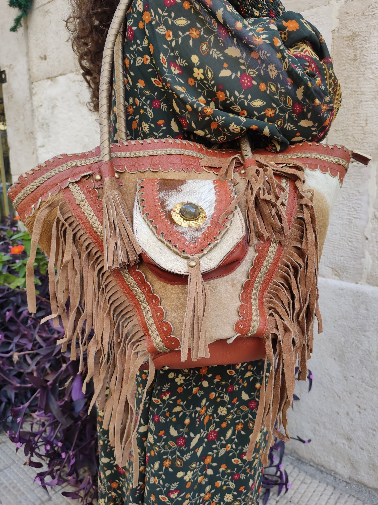 Superlative brown sheepskin bag, cowgirl style. Robust and versatile. It will make your outfit unique!!