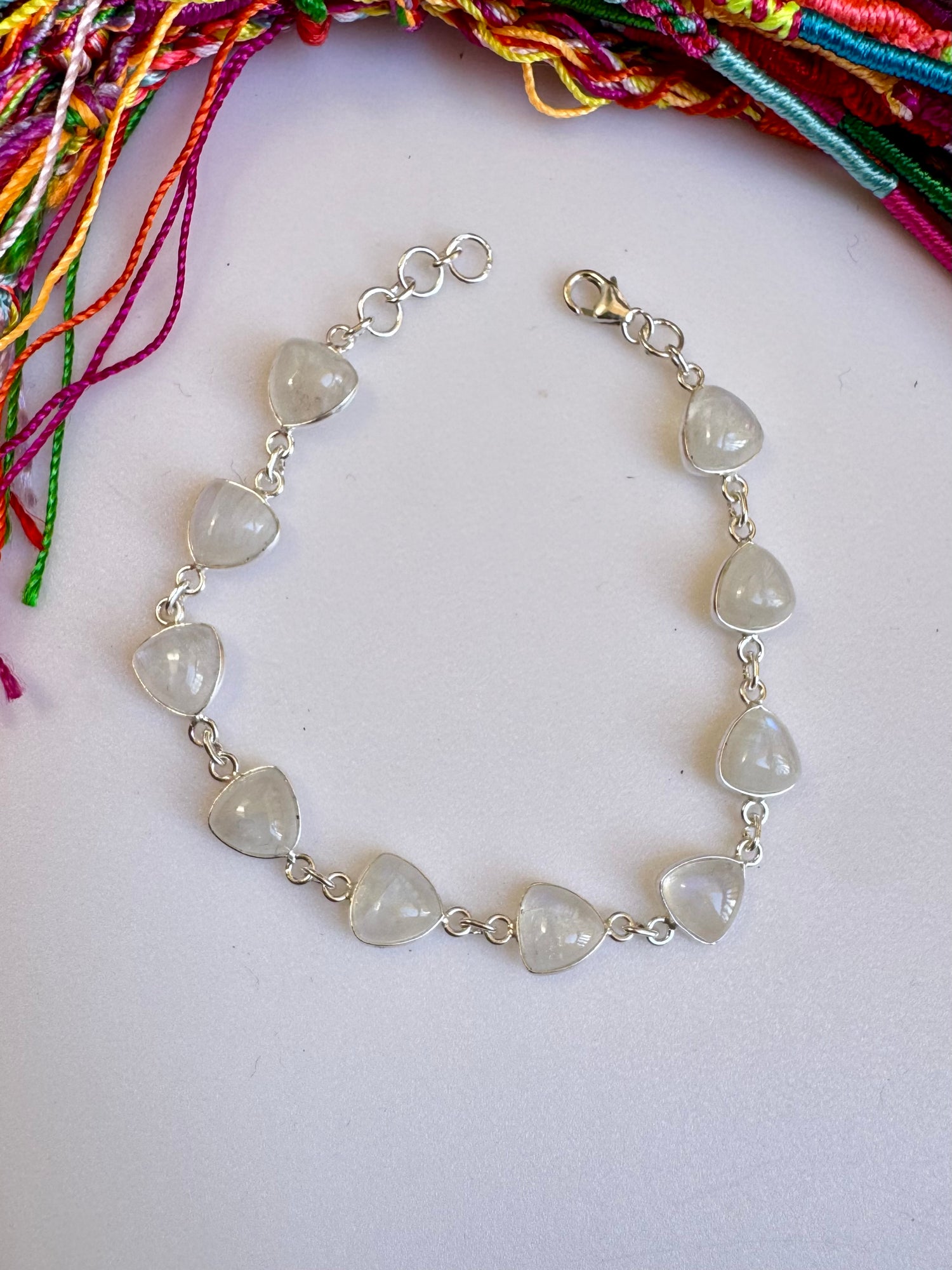 925 silver bracelet with rainbow moonstone drops. Total length 18cm + 2cm chain.