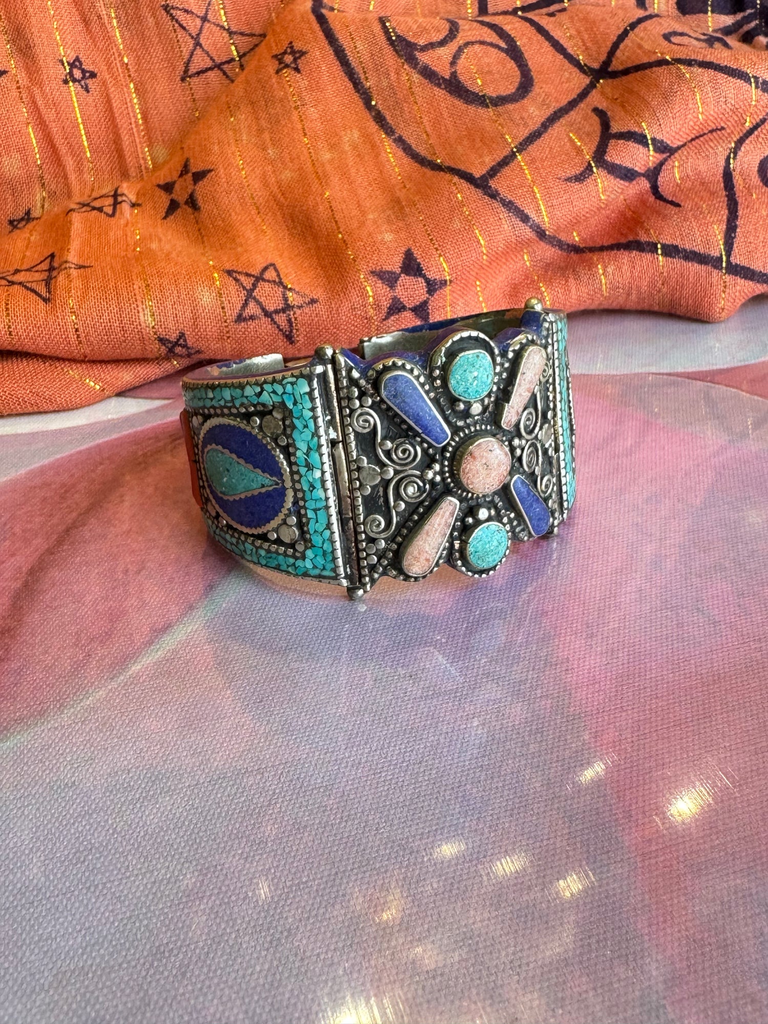 Vintage Nepalese pink and blue turquoise flower bangle bracelet