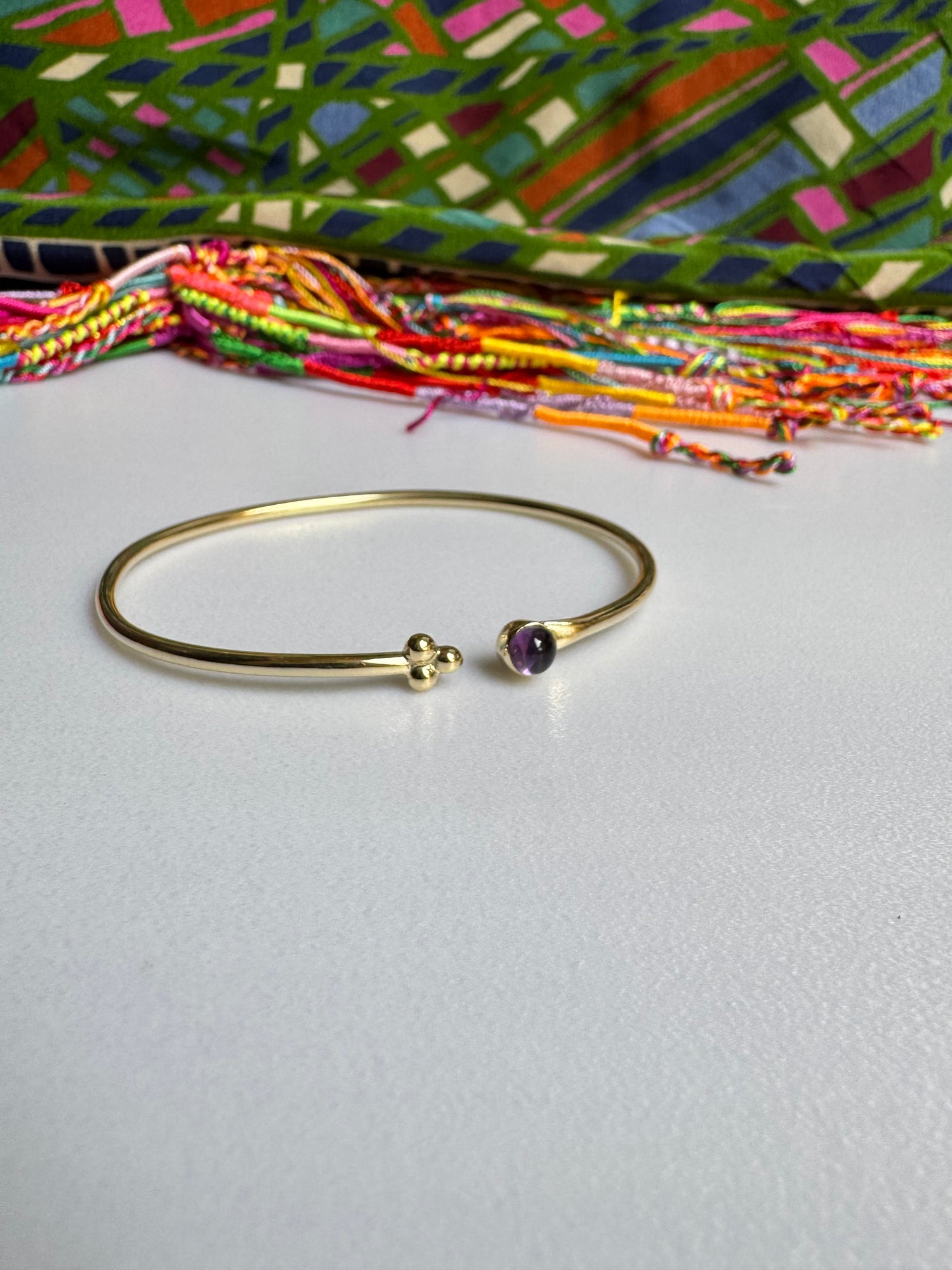 Rigid bracelet in hypoallergenic golden brass and amethyst-like resin insert. Adjustable.