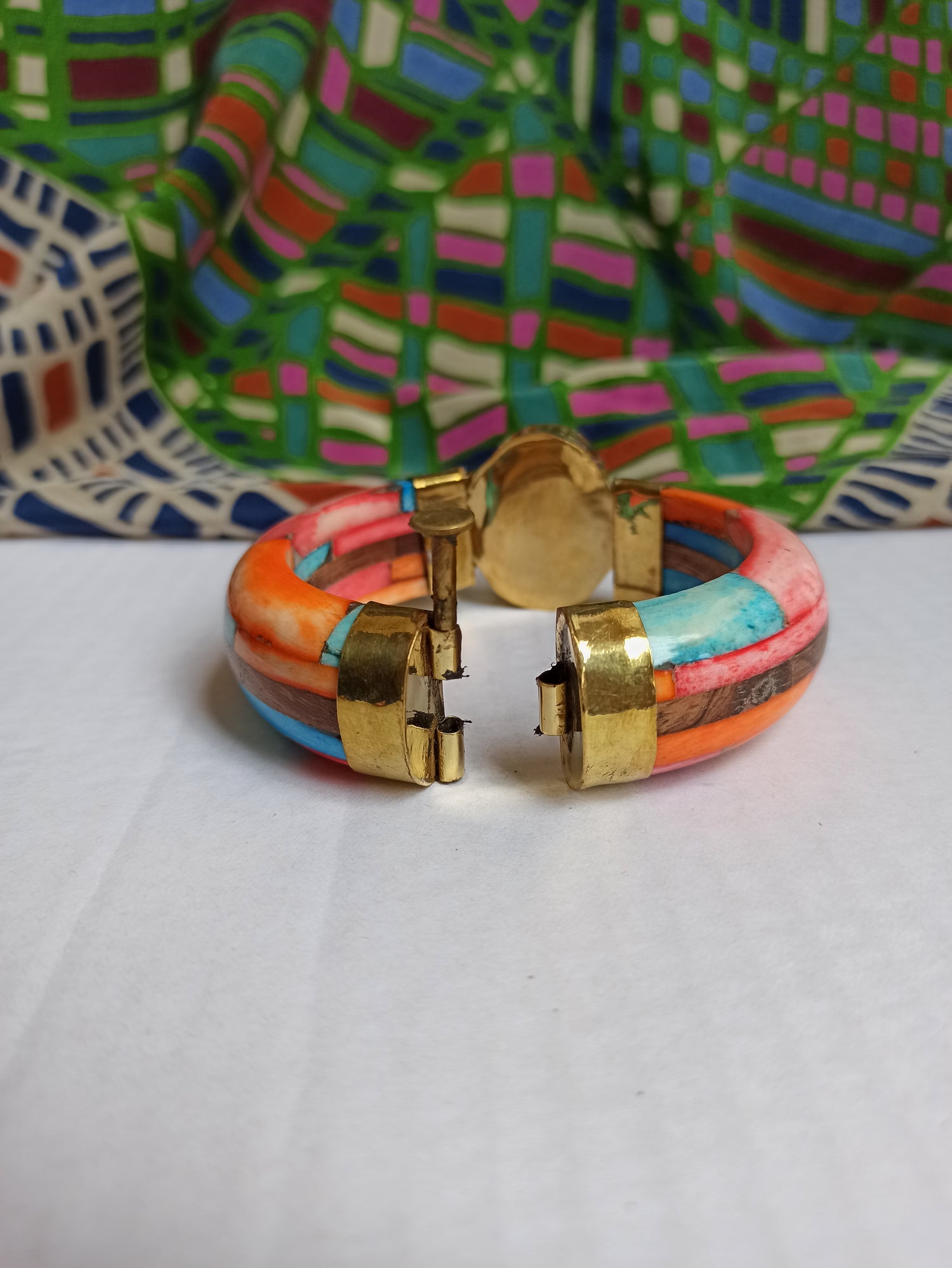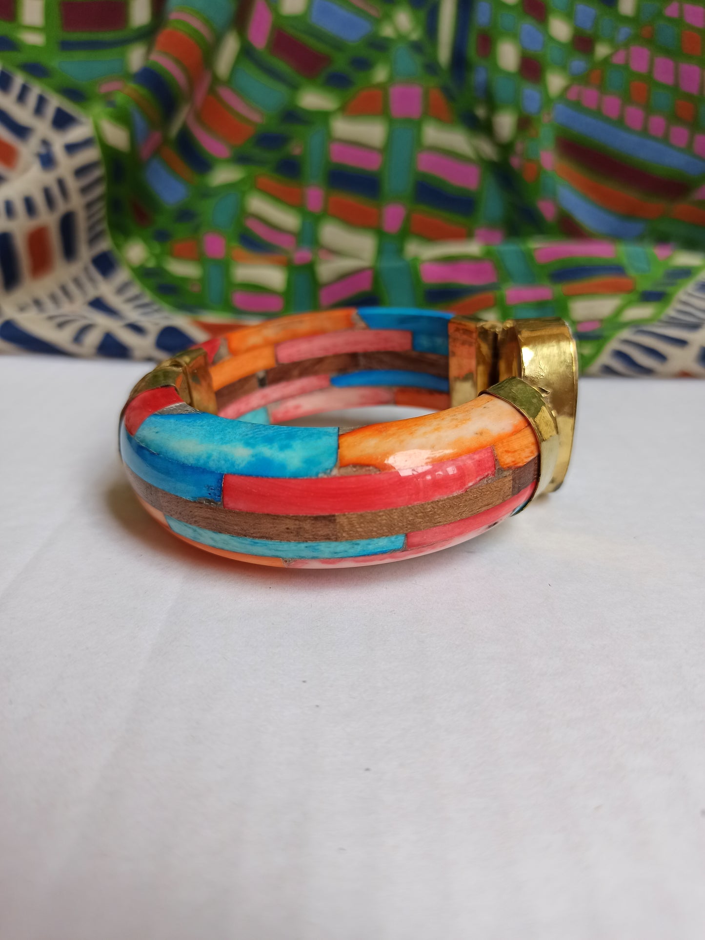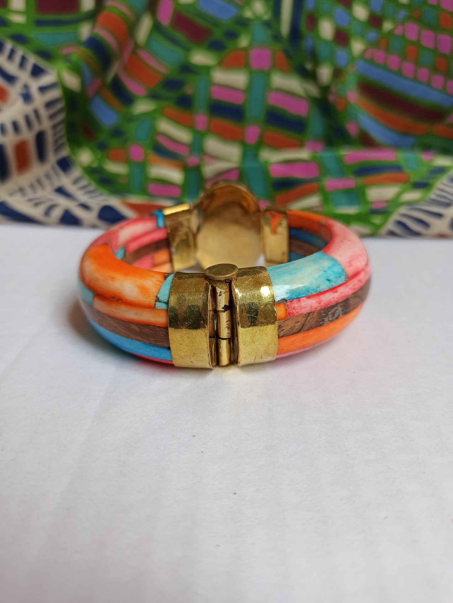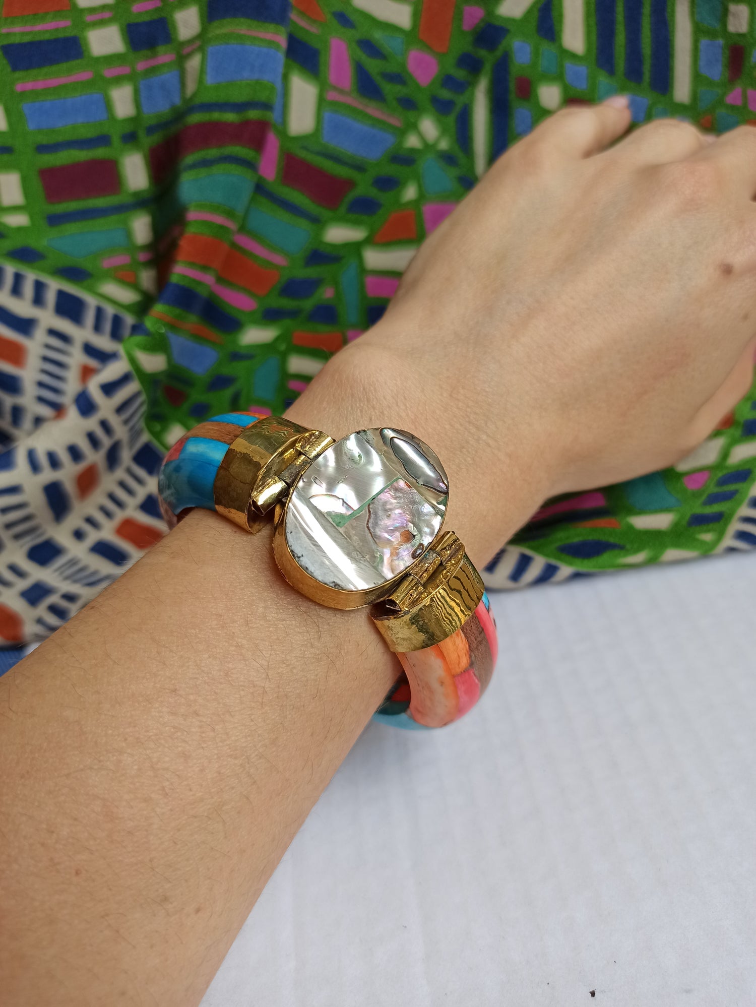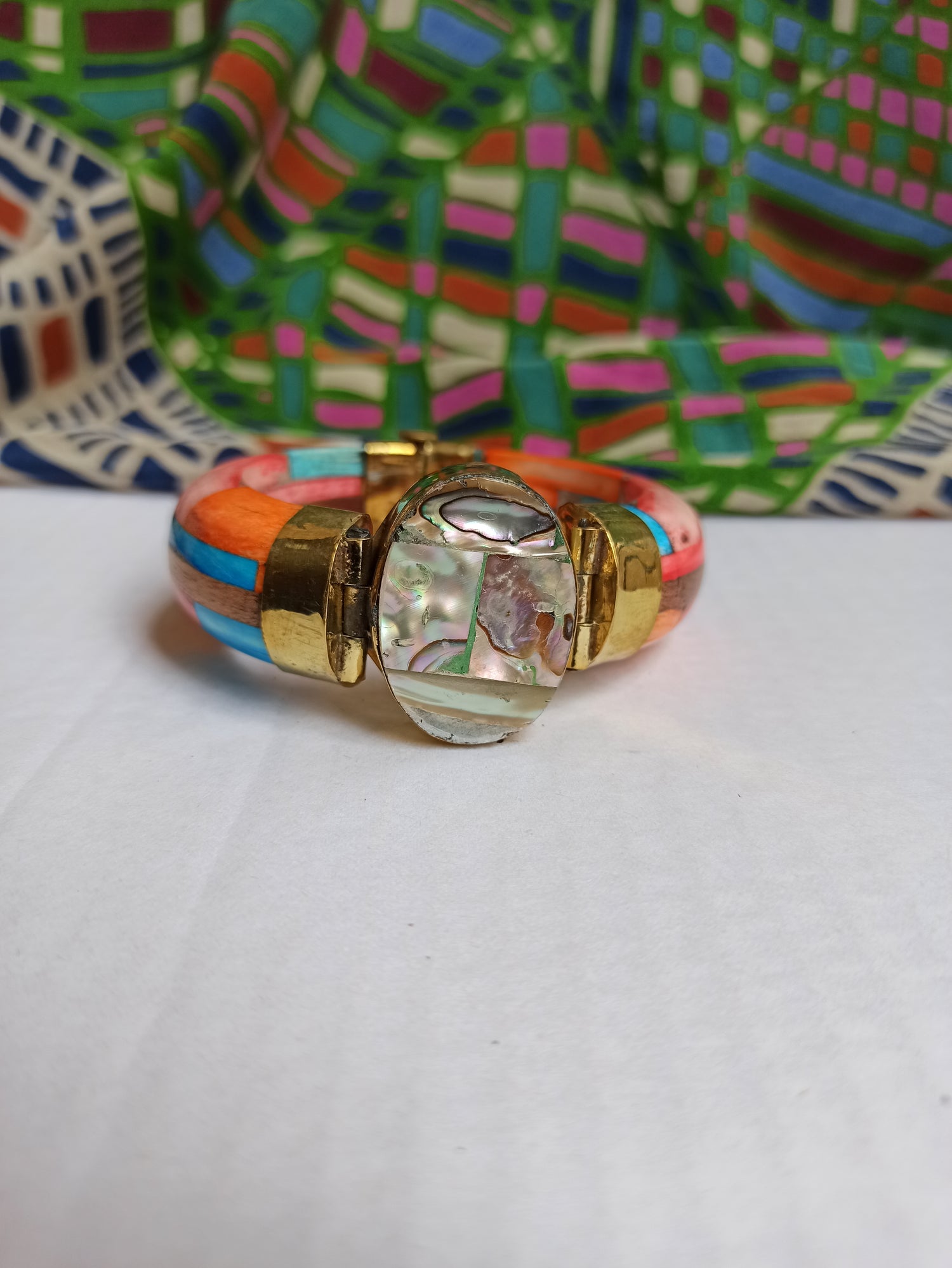 Large multicolored rigid bracelet with mother-of-pearl insert