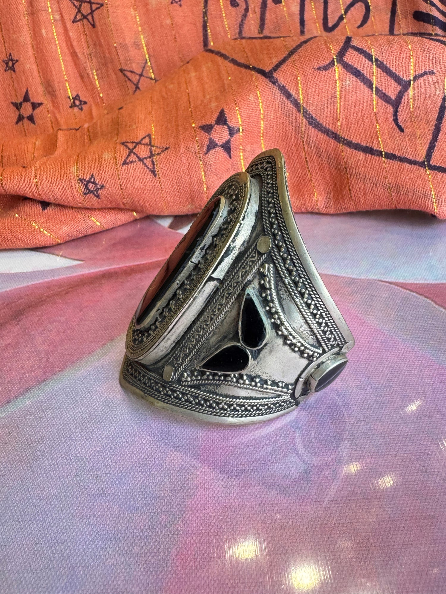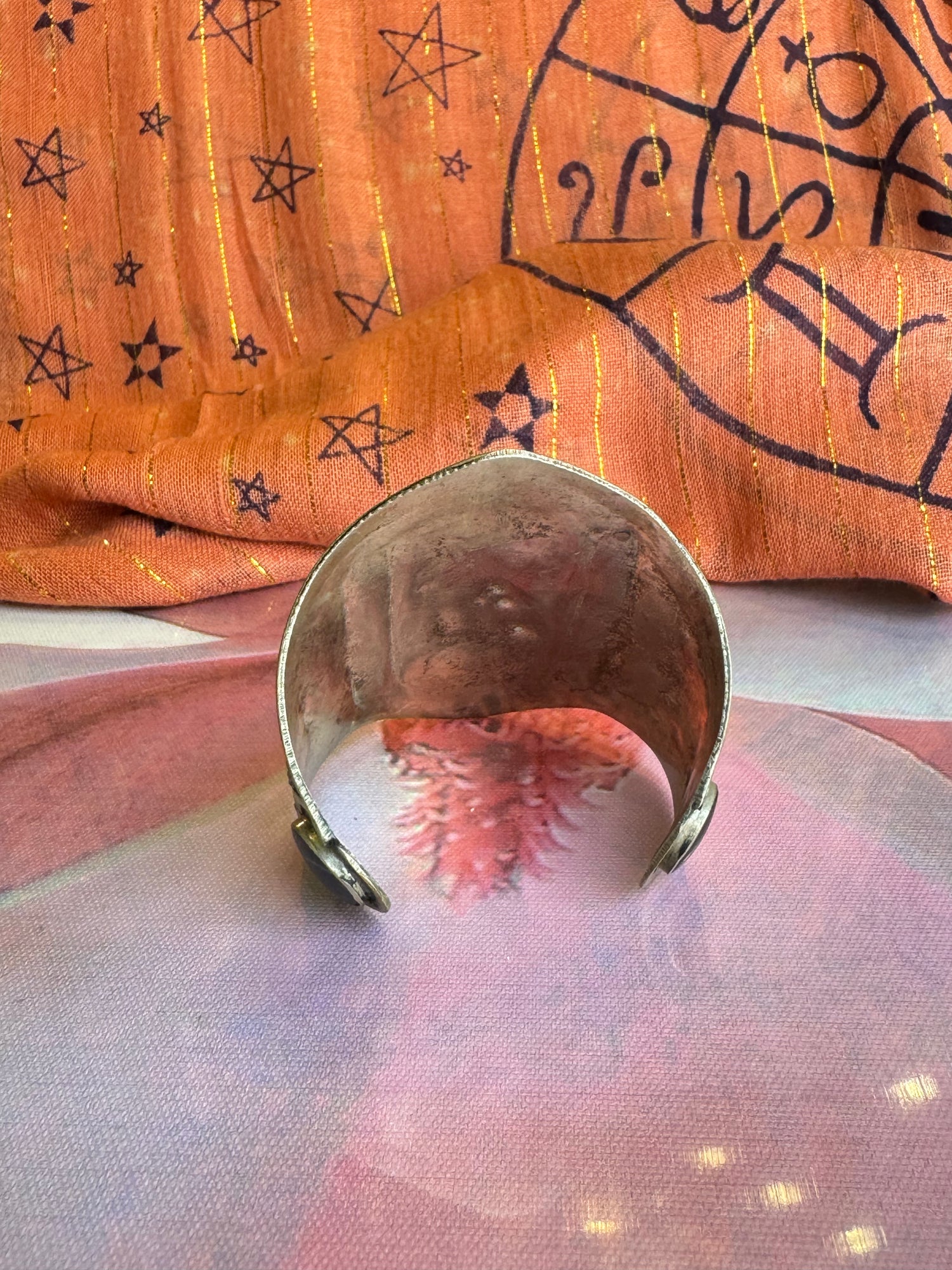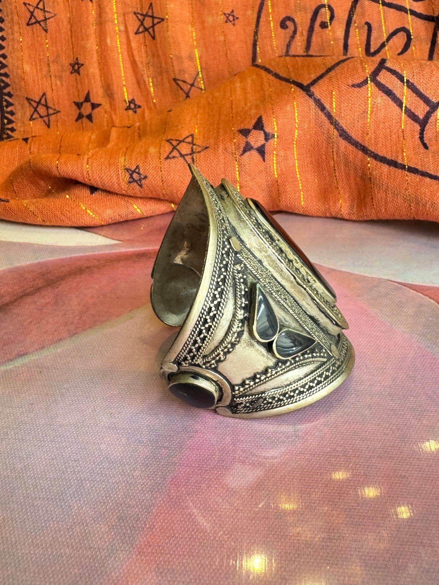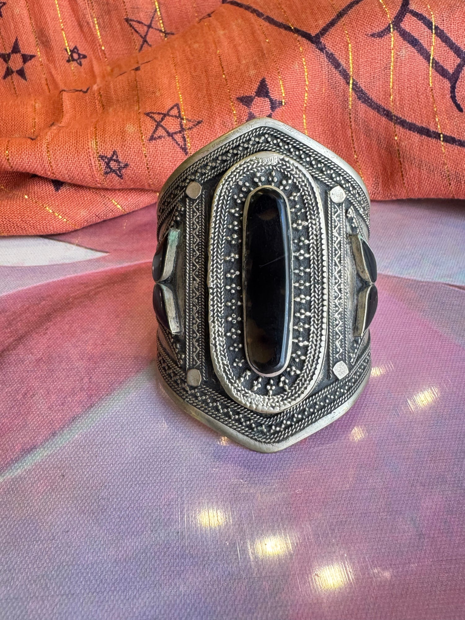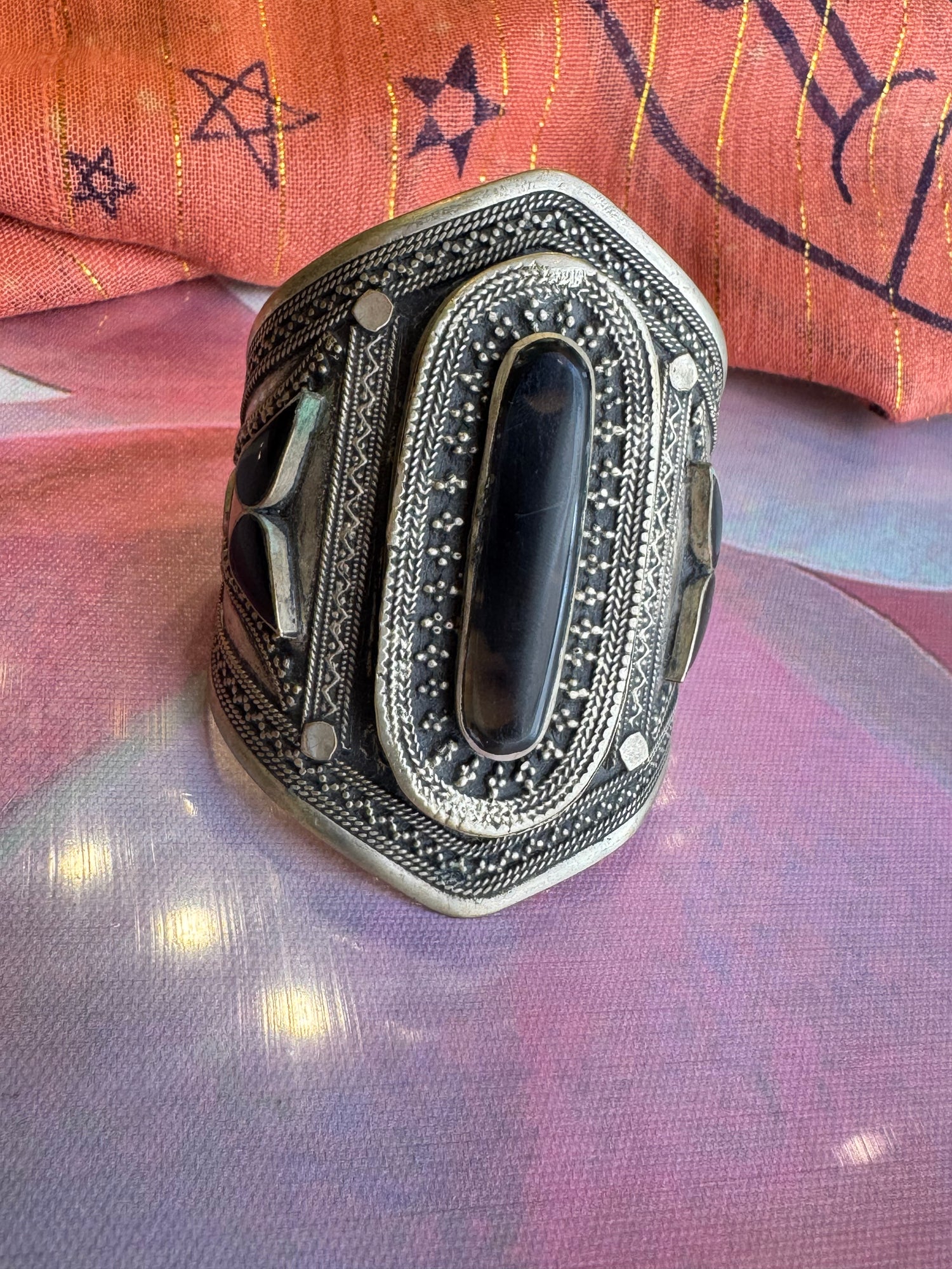 Antique, adjustable open slave bracelet in metal and agate. In some places, the deep black fades into softer shades, creating a striking, organic contrast.