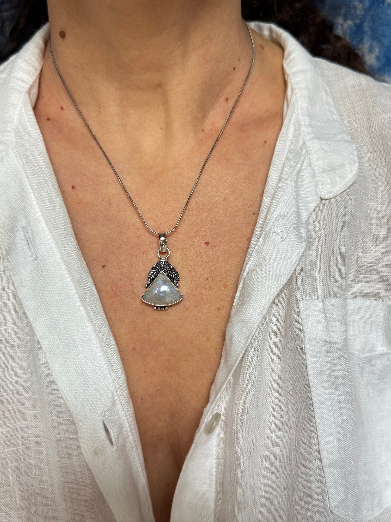 Ciondolo in ottone placcato argento con inserto pietra di luna arcobaleno.