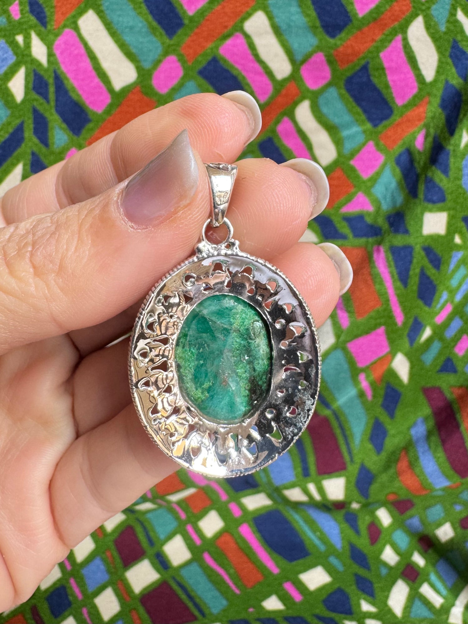 925 silver pendant with an emerald root set in it.