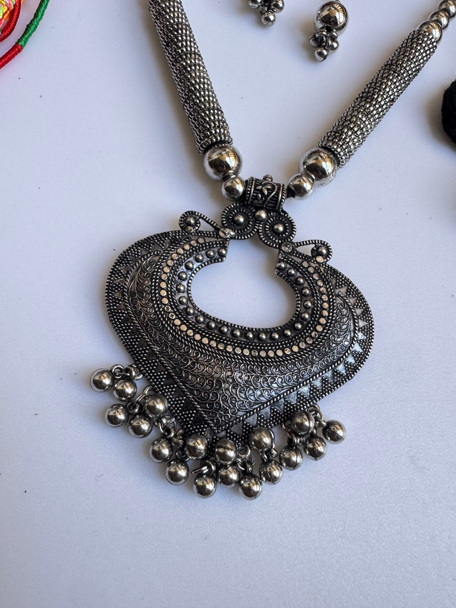 Handcrafted in India, this necklace features a large silver-tone metal pendant crafted with chiseled details and small decorative bells that create a delicate tinkling sound. The rich, refined design pairs perfectly with matching earrings in the same style.