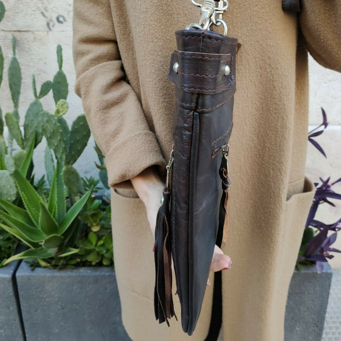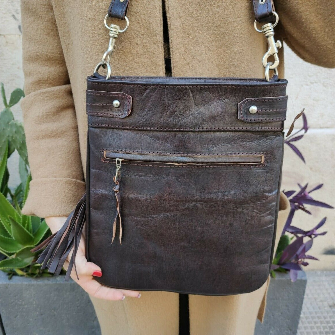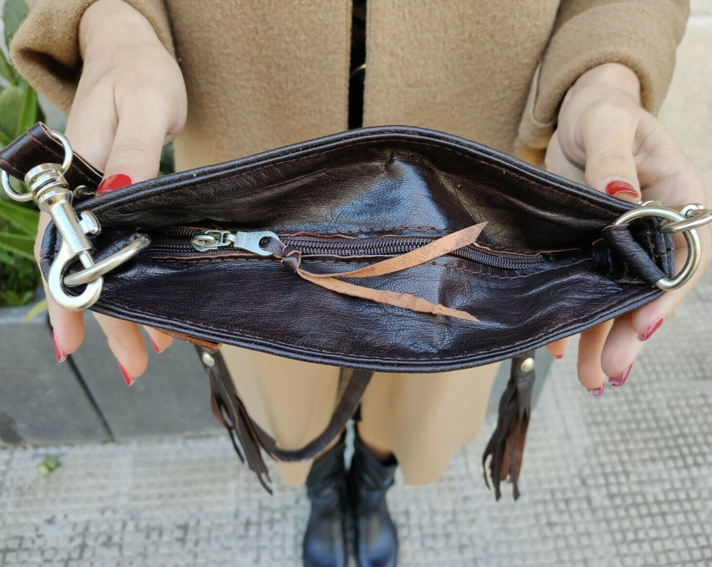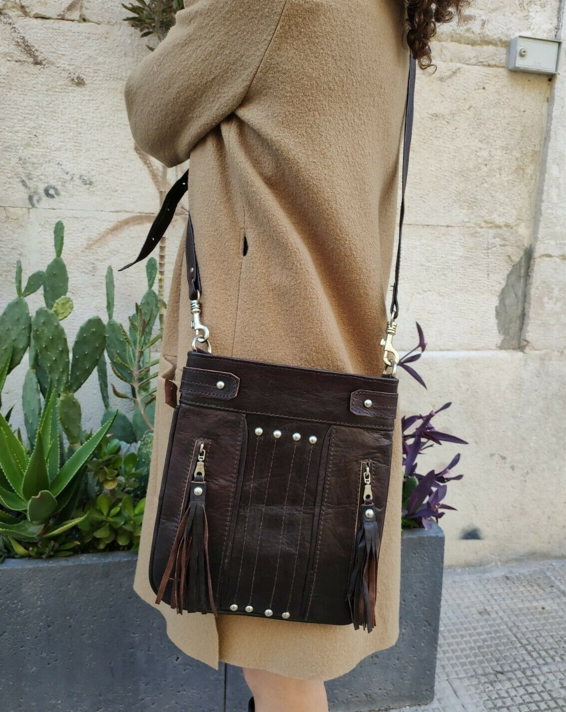 In 70s hippie style, this dark brown leather shoulder bag is enriched with side pockets and decorated with silver studs and fringes.