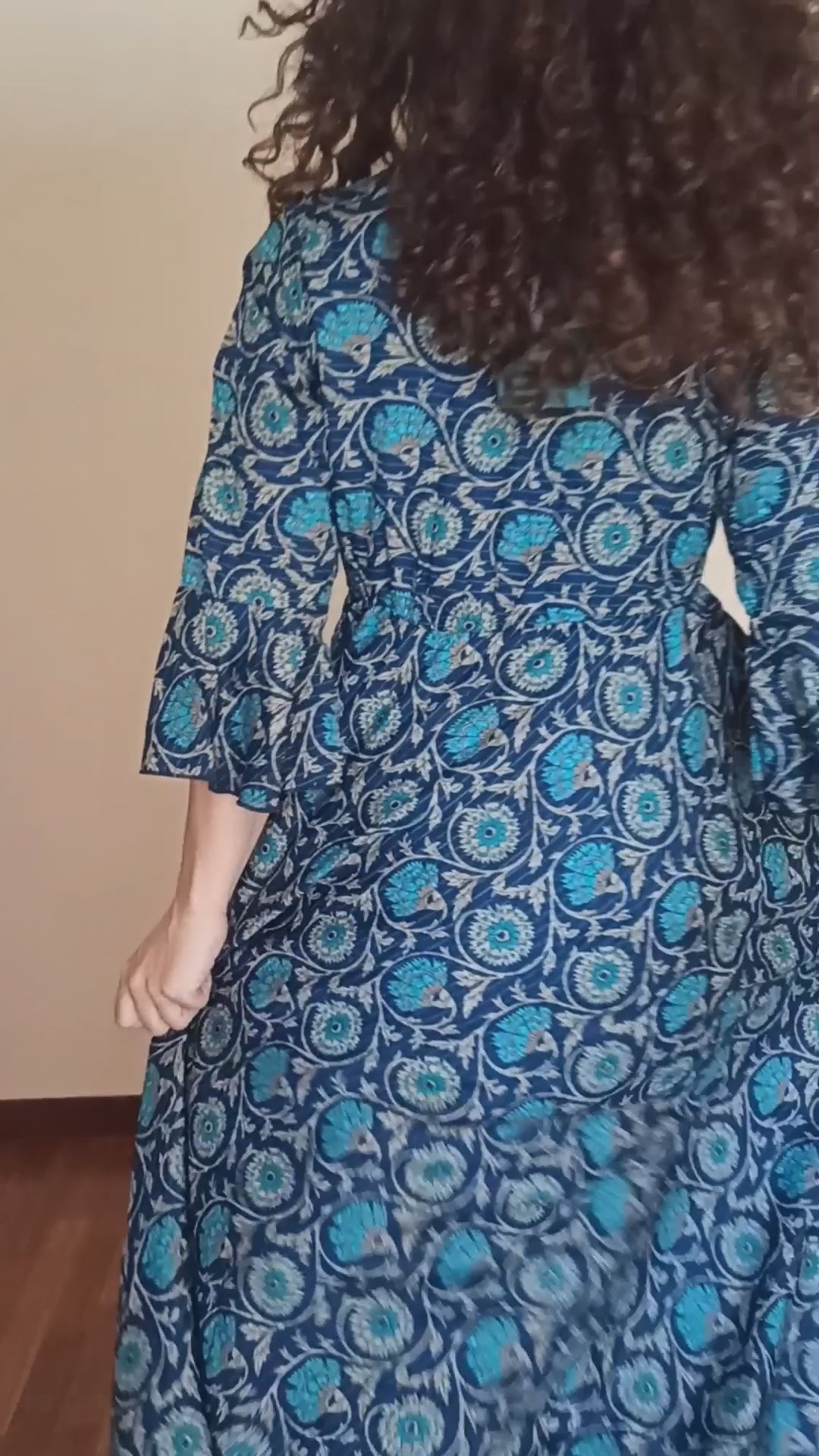 This long dress captivates at first glance with its boho-chic style and the natural elegance of its flowing lines. Crafted from a light and airy fabric, it features a vibrant floral and geometric print in shades of deep blue, turquoise, and ivory, with circular motifs reminiscent of mandalas and intertwining stylized branches.