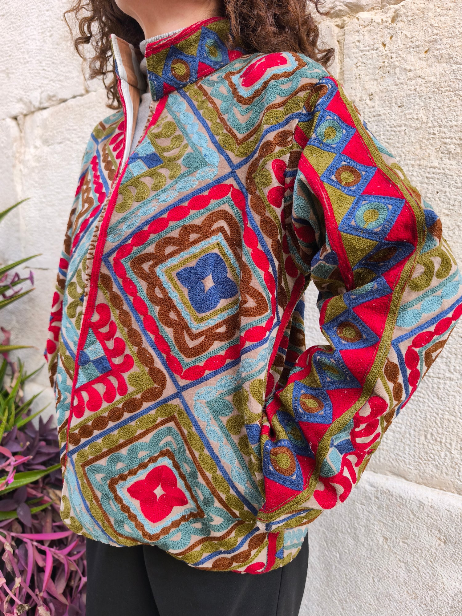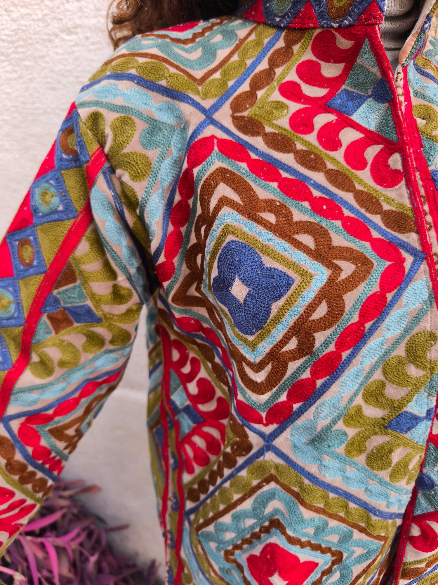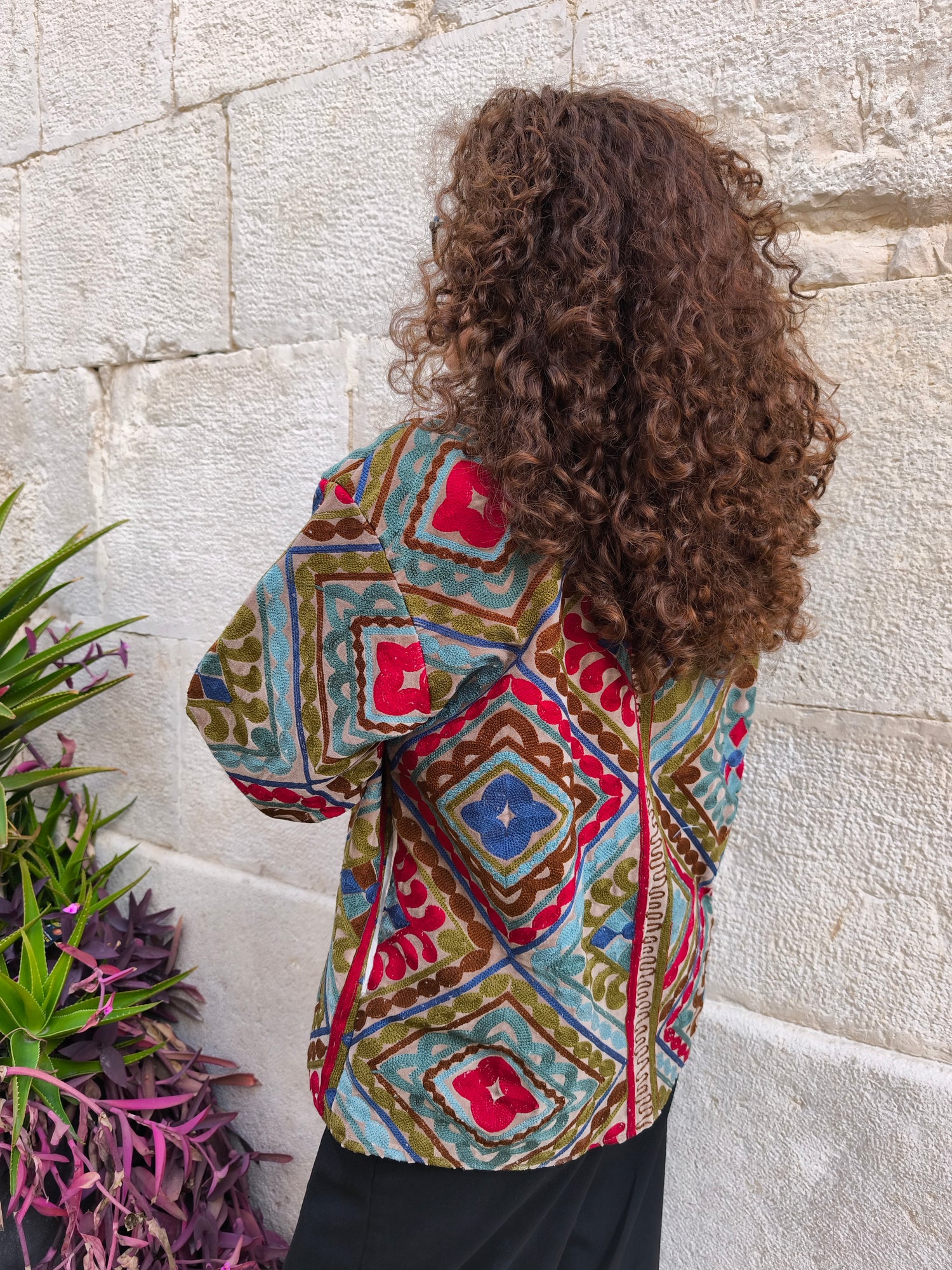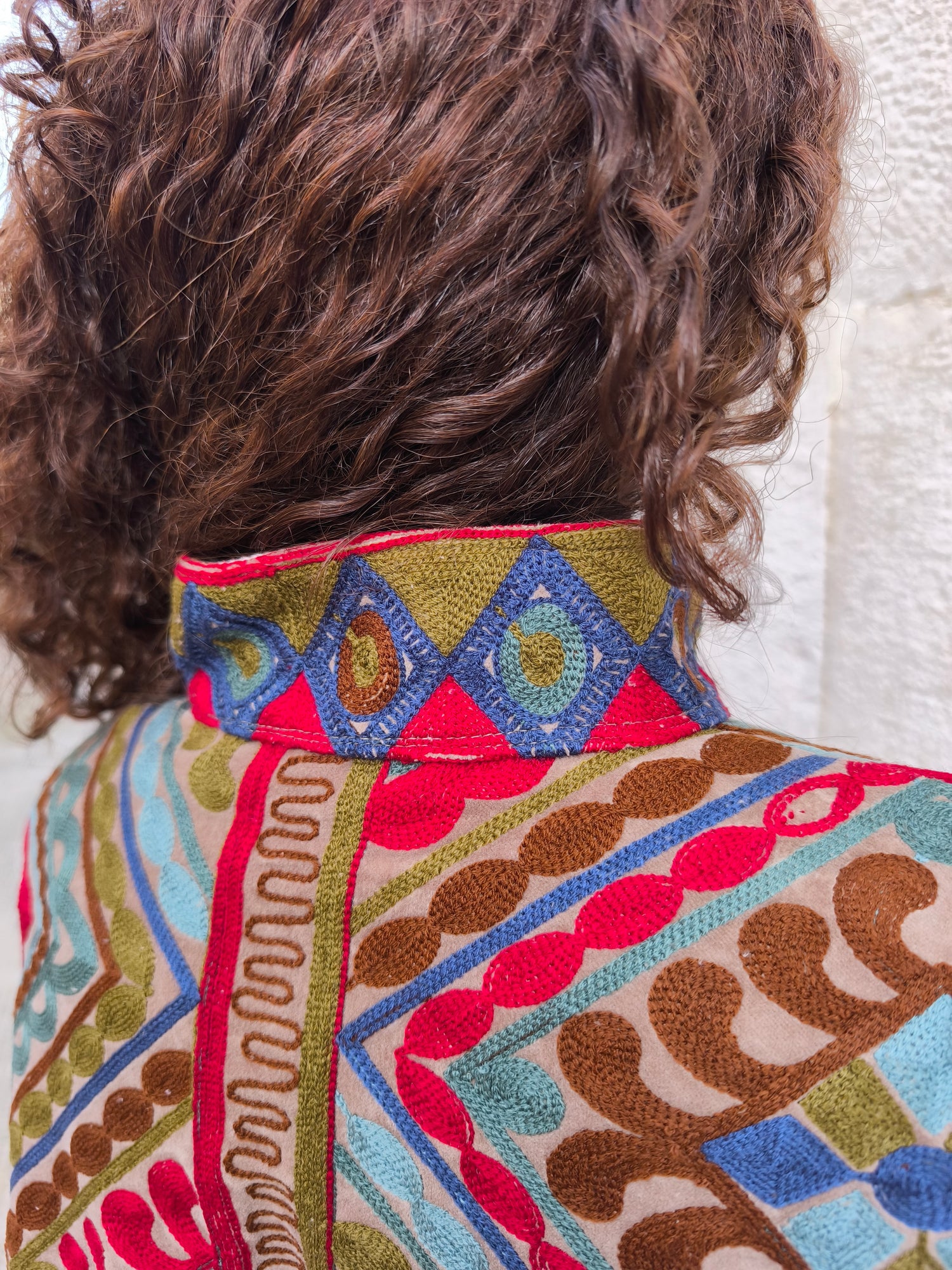 Colorful, bright, and rich in artisanal details, this Suzani jacket is a piece that combines tradition and creativity. Crafted from velvet with hand-embroidered details.
