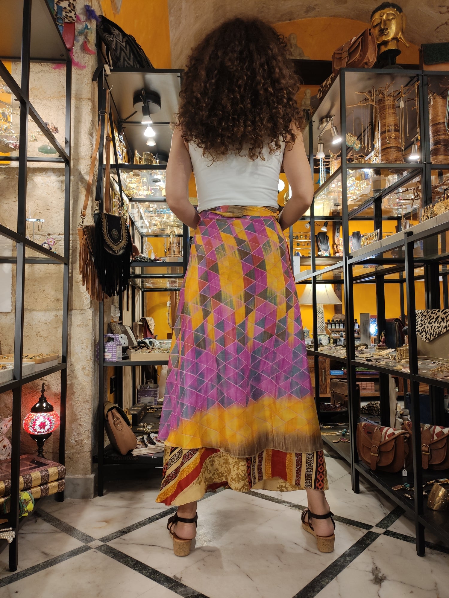 Gypsy style wrap skirt handmade with vintage sari fabrics.