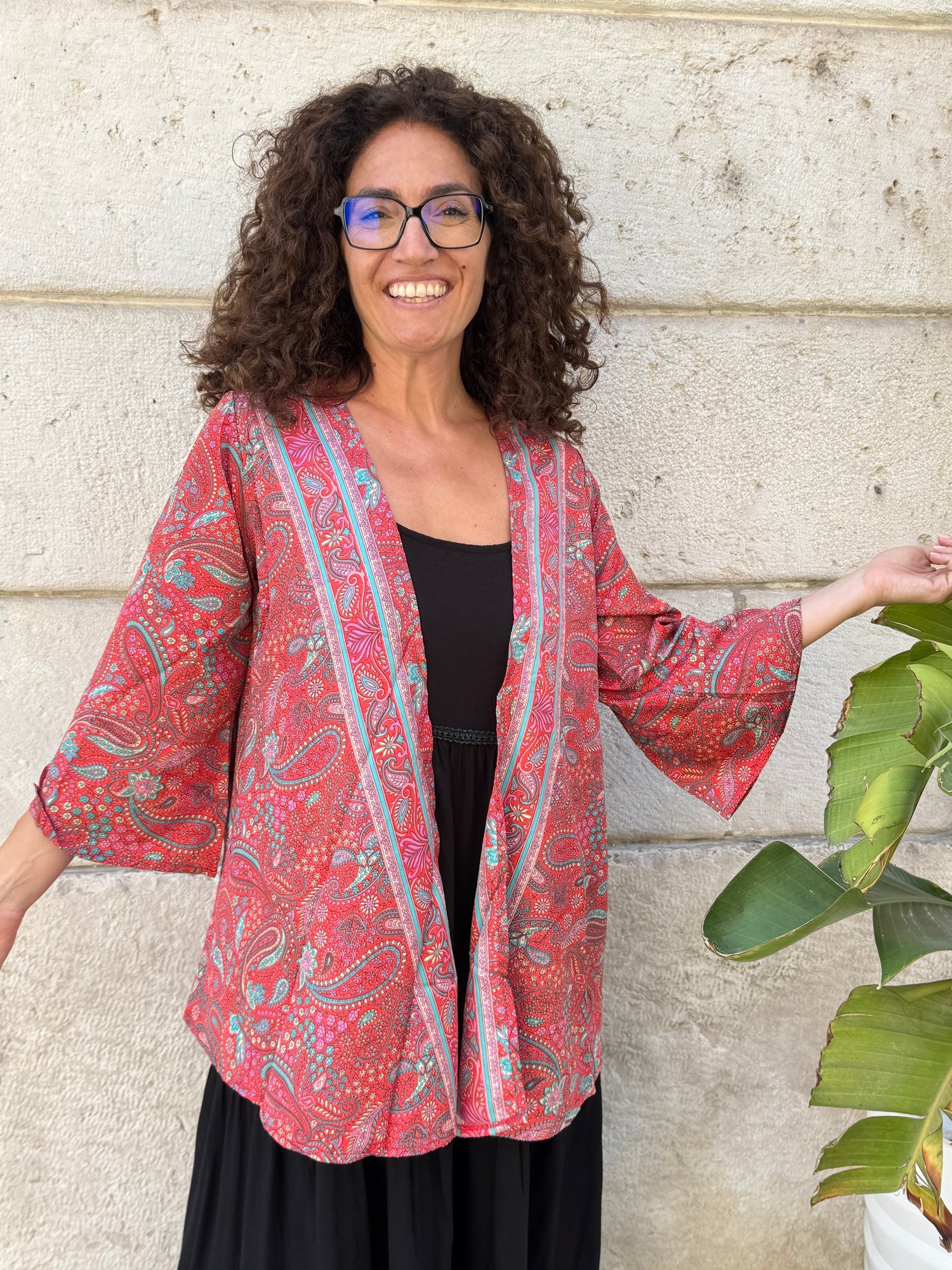The wide three-quarter sleeves and soft silhouette offer a comfortable fit, perfect for wearing open over a top and trousers for a boho chic look, ideal for both day and summer evenings.