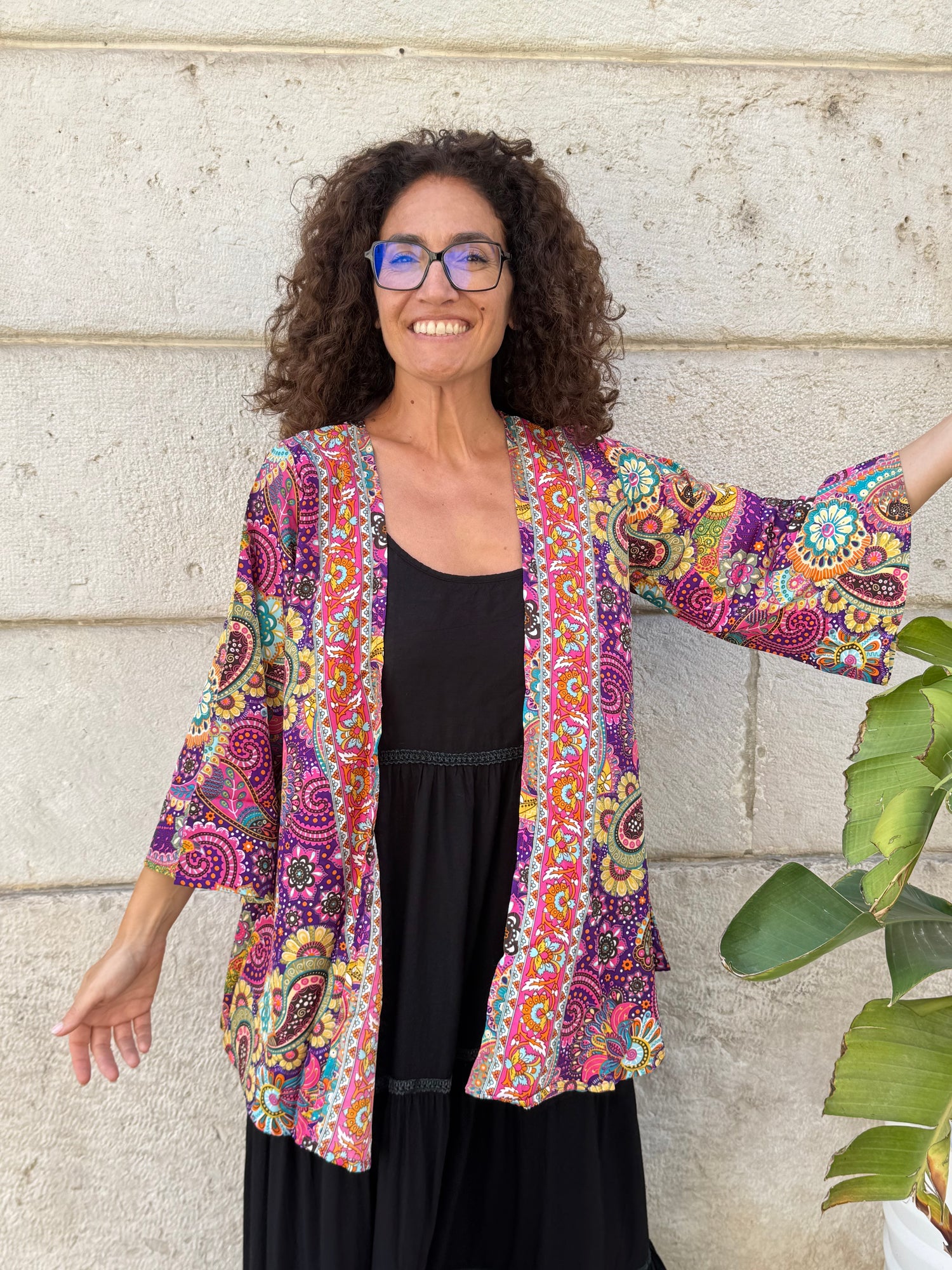 The wide three-quarter sleeves and soft silhouette offer a comfortable fit, perfect for wearing open over a top and trousers for a boho chic look, ideal for both day and summer evenings.