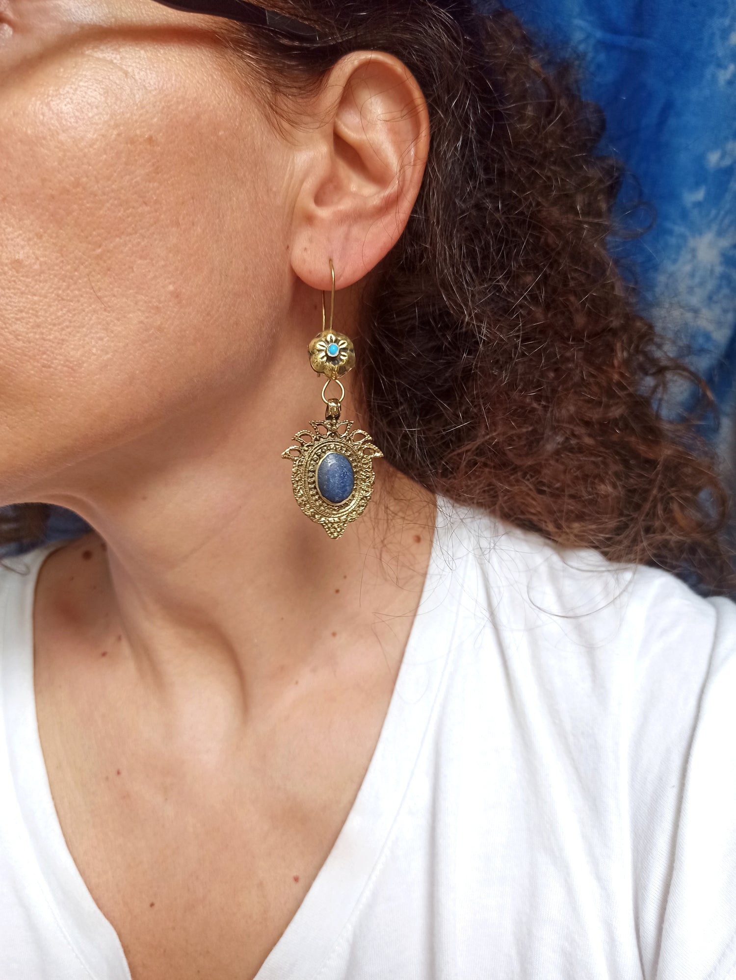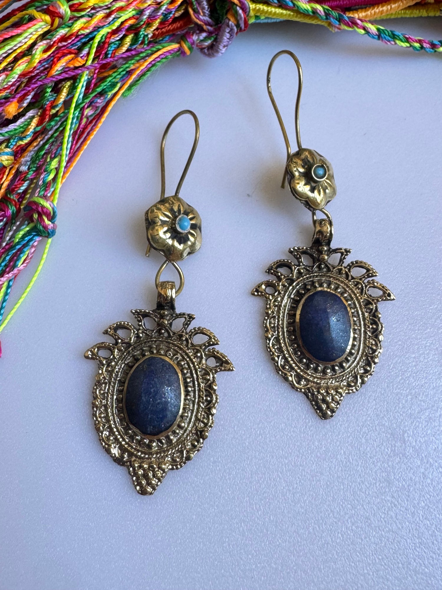 Vintage gold-tone metal earrings with gold-tone metal insert and lapis lazuli and light blue insert