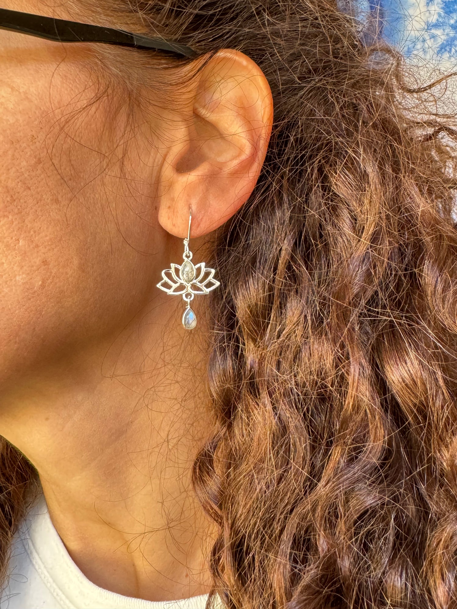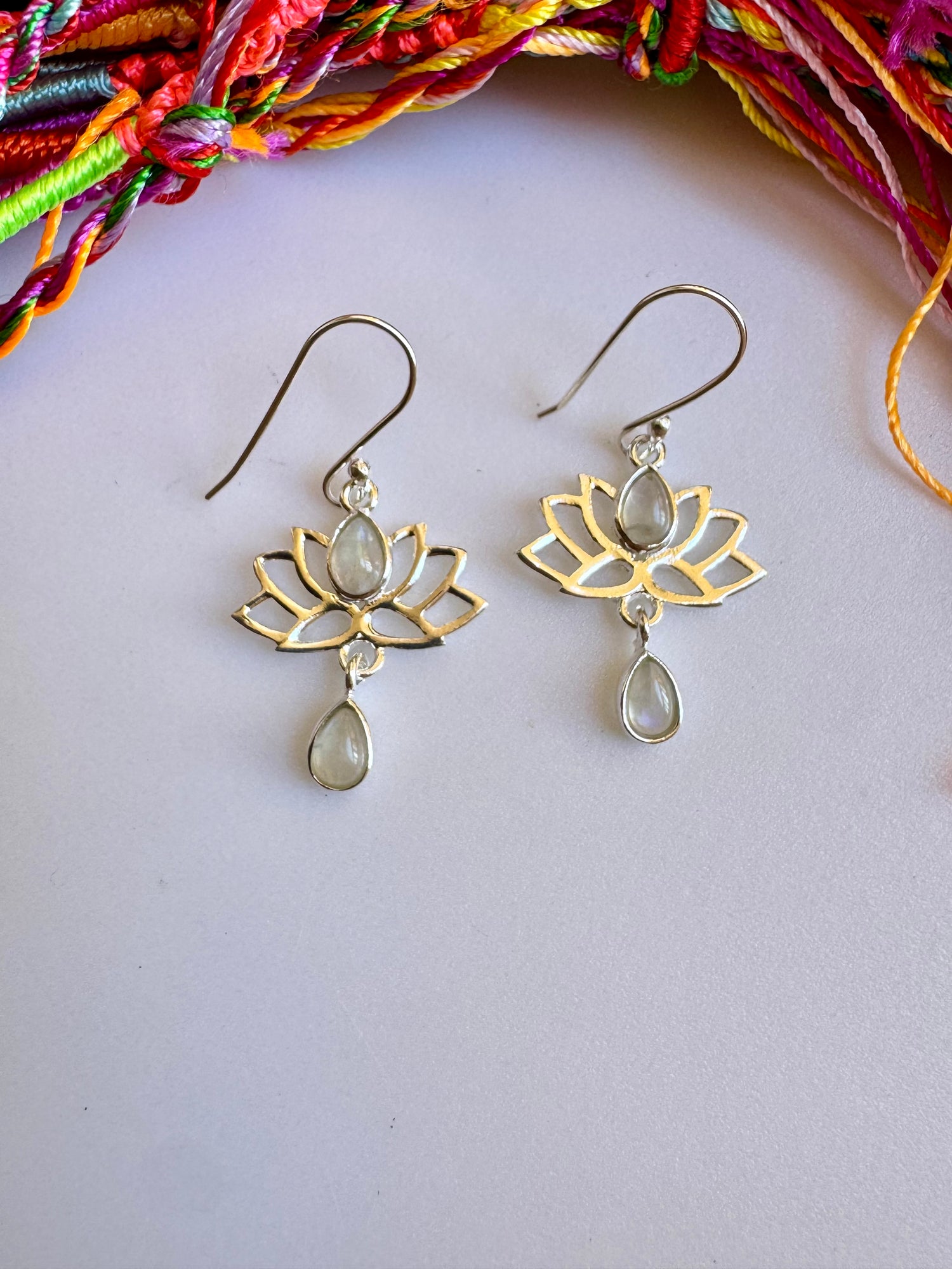 Orecchini in argento 925 con una pietra di pietra di luna arcobaleno. Lunghezza 3,7cm circa compreso il gancio.
